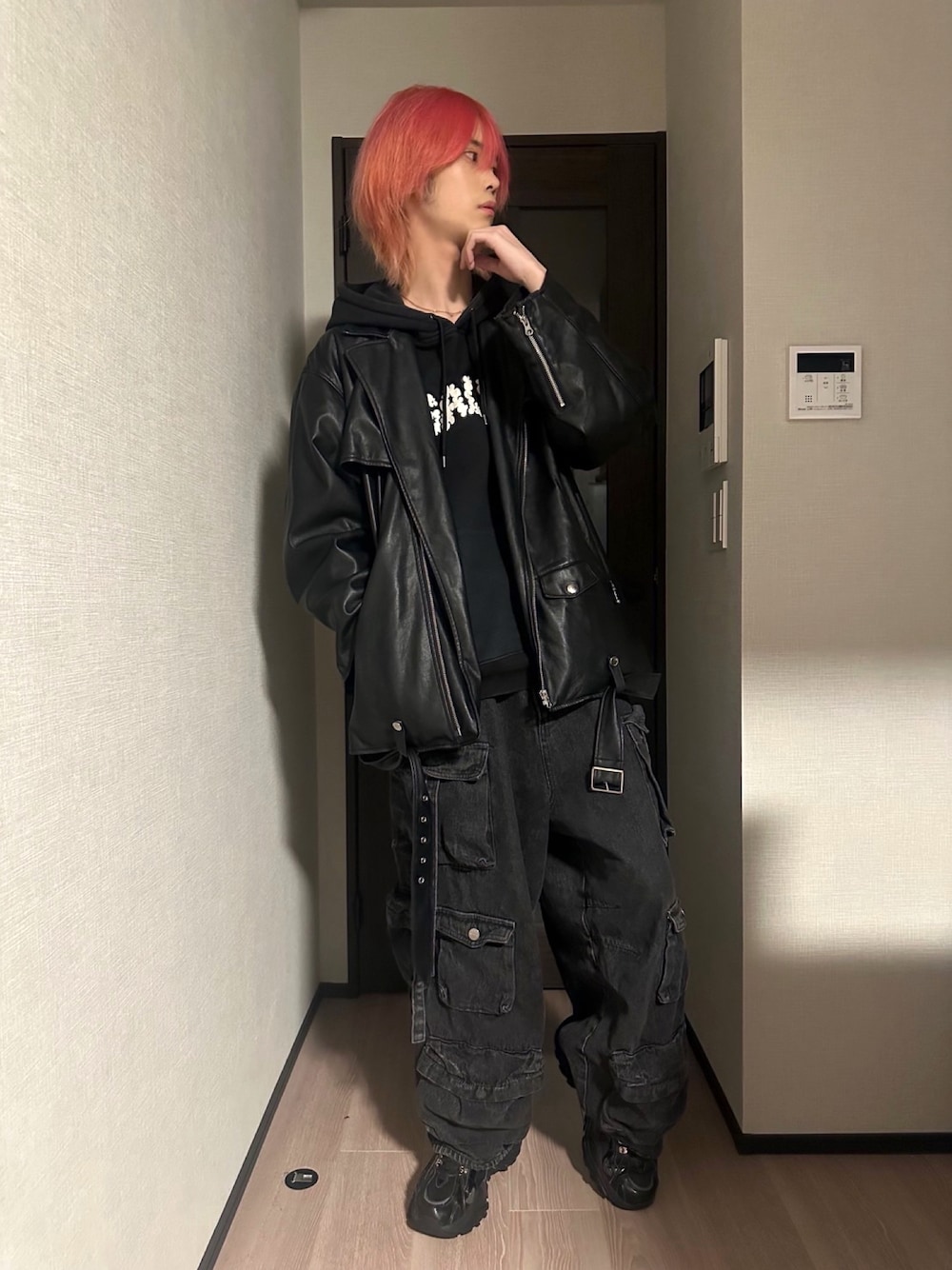 outer:ADRER tops :GALFY bottoms: ADRER shoes: ADRER もう何年も冬の1軍アウターしてくれてるこのライダース、着方によっては個性強すぎて万人受けしづらいけど、パーカーを中に着ると印象が柔らかくなってめちゃ良い✌🏻