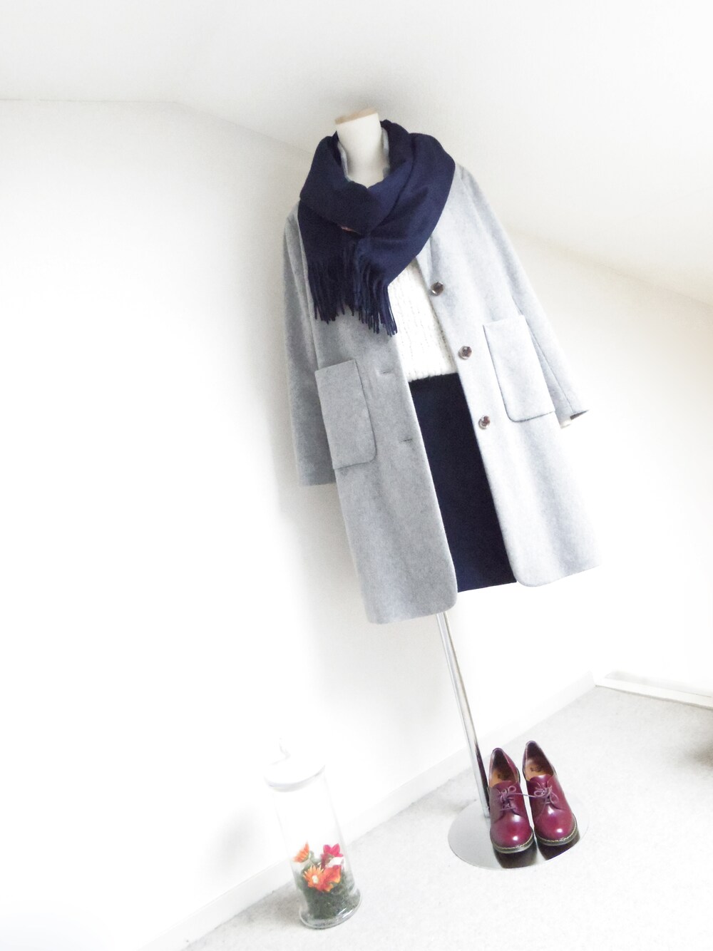 シンプルに白ニットに紺色タイトスカートを合わせて☻ マーチンのボルドーの靴で 少しだけ差し色ポイント グレーのチェスターに大判ストールをぐるぐる・:*ೄ‧͙·*. グレー×ネイビーコーデ ありきたりシンプルスタイルでした.₊̣̇.ෆ