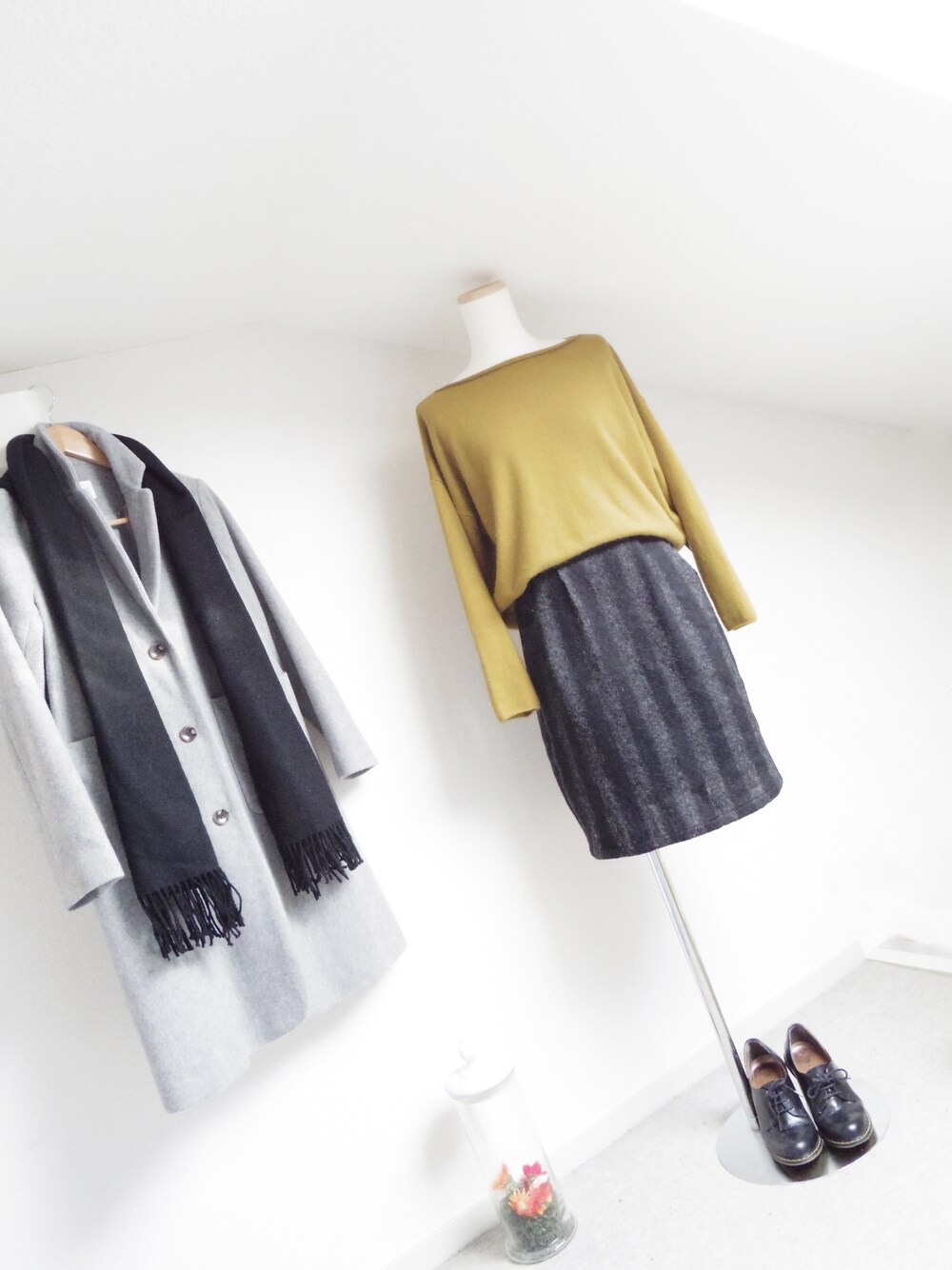 カラシ色のニットにストライプのスカートを合わせて☻ カラシ×クロ マーチンのブーティを合わせて・:*ೄ‧͙·*.