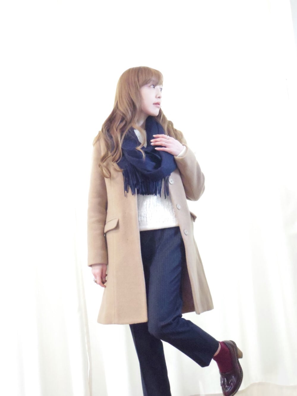 今日は寒いですね。・゜・ こんな日はお家に居たいけど お仕事☻ ベージュのウールコートに 白ニットと 紺色のストライプパンツを合わせて 寒いので 紺色の大判ストールを巻いて ベージュ×ネイビーコーデ パンプスはマーチンのボルドー 靴下屋さんの赤の靴下を合わせて 差し色に.₊̣̇.ෆ ではでは お仕事の方 頑張りましょう・:*ೄ‧͙·*. お休みの方も寒いけど 良い一日をお過ごしください.₊̣̇.ෆ