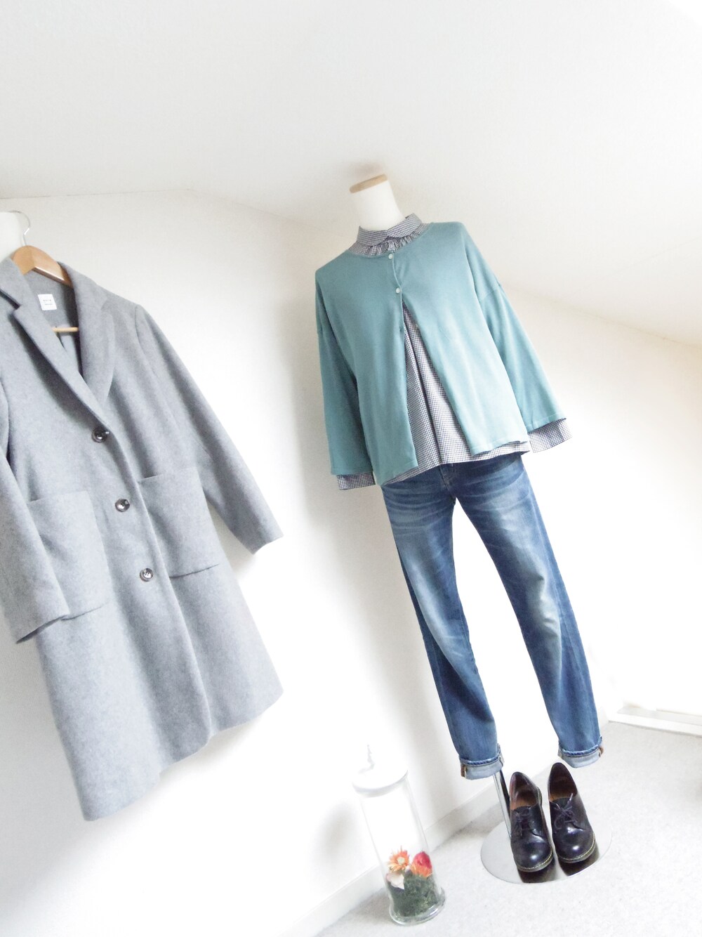 くすんだブルーグリーンのカーディガンに チェックのシャツを合わせて☻ 小さめな丸襟のシャツは少し甘い感じだから ジーンズで甘くなり過ぎないように.₊̣̇. グレーのロングチェスターで マニッシュに