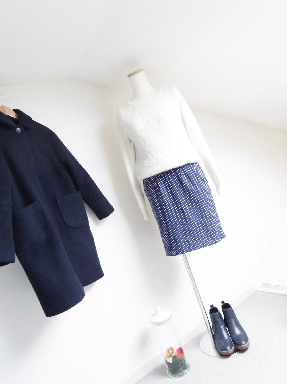 ニット素材のドットぽいスカート ブルーにハマっていた時の・:* ツモリのショートブーツを合わせて☻ ブルー×白のシンプルコーデ ルーズなシルエットの紺色コートで ふんわりゆるめスタイルにね・:*ೄ‧͙·*.