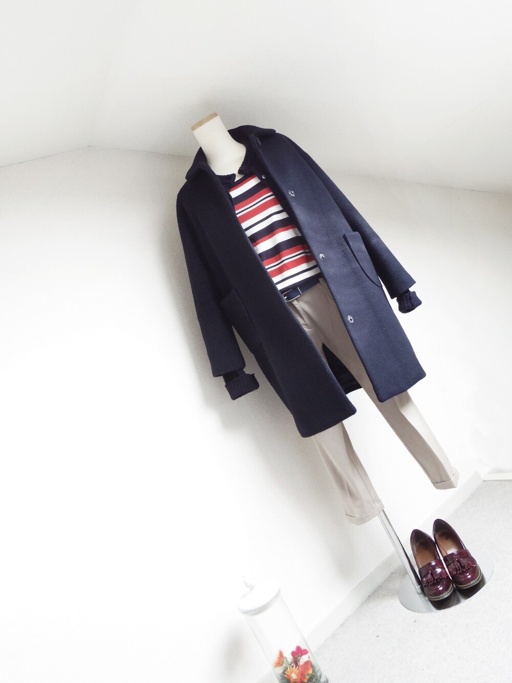 紺色カーディガンに 少し明るめの色合いのボーダー ベージュのクロップドパンツを合わせて.₊̣̇. ベージュパンツ×ボーダーコーデ・:*ೄ‧͙·*. シンプルにね☻