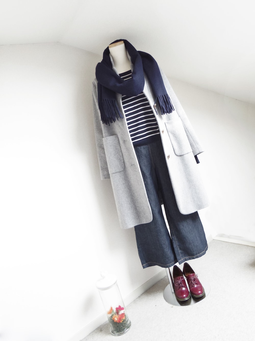 デニムのワイドパンツとボーダーニット ありきたりだけど… グレーのロングチェスターで おとなルーズスタイル・:*ೄ‧͙·*. 寒いから大判のストールをぐるぐる巻いて 寒いけど早く春物着たいね☻