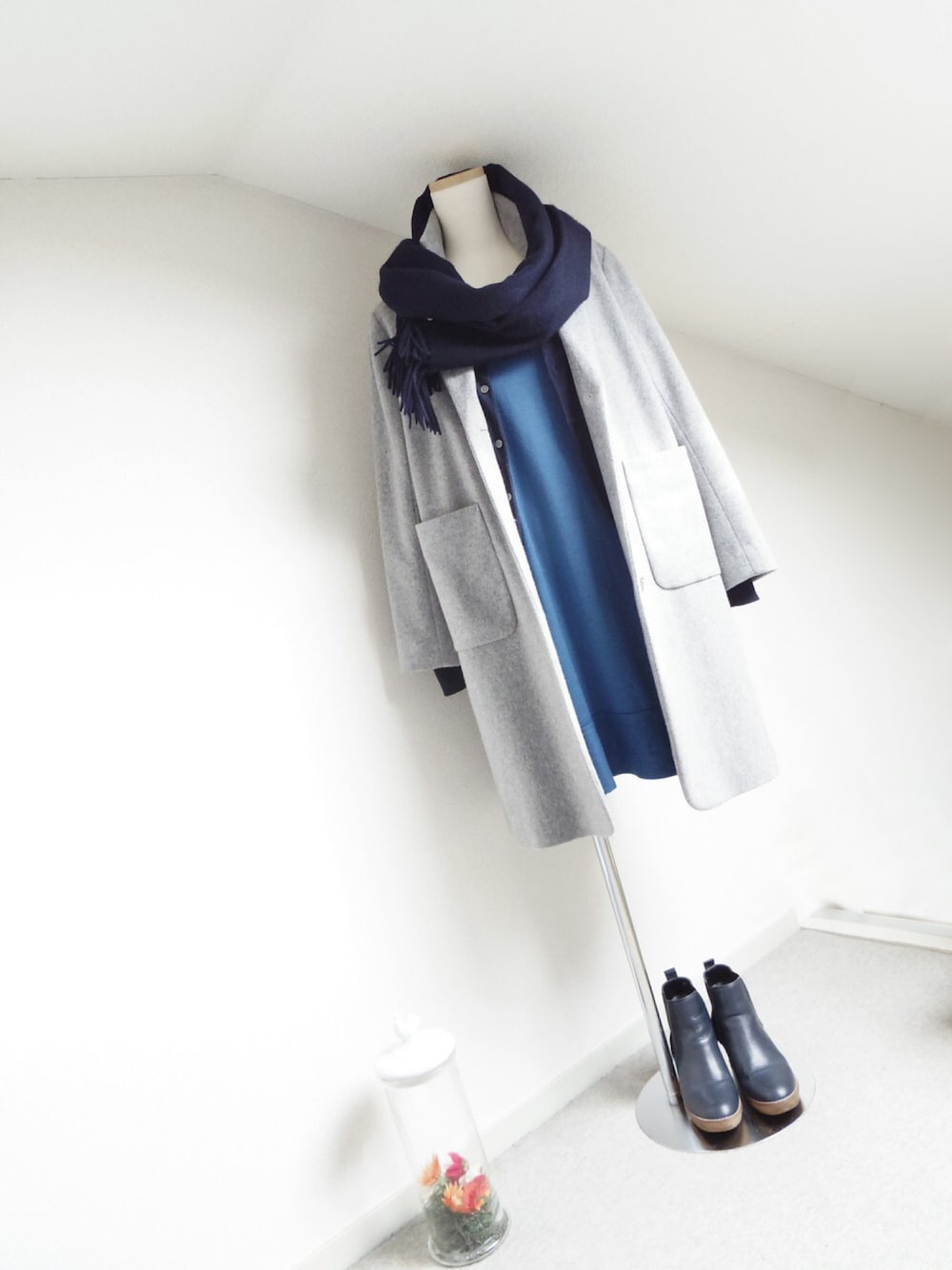 ブルーのニットワンピに 紺色のカーデを合わせて・:*ೄ‧͙·*. グレーのコートに 紺色の大判ストールをクルクル☻ ツモリのショートブーツを履いて.₊̣̇. ブルー×ネイビーコーデ*¨*• ♡ またまたありきたりコーデでした☻