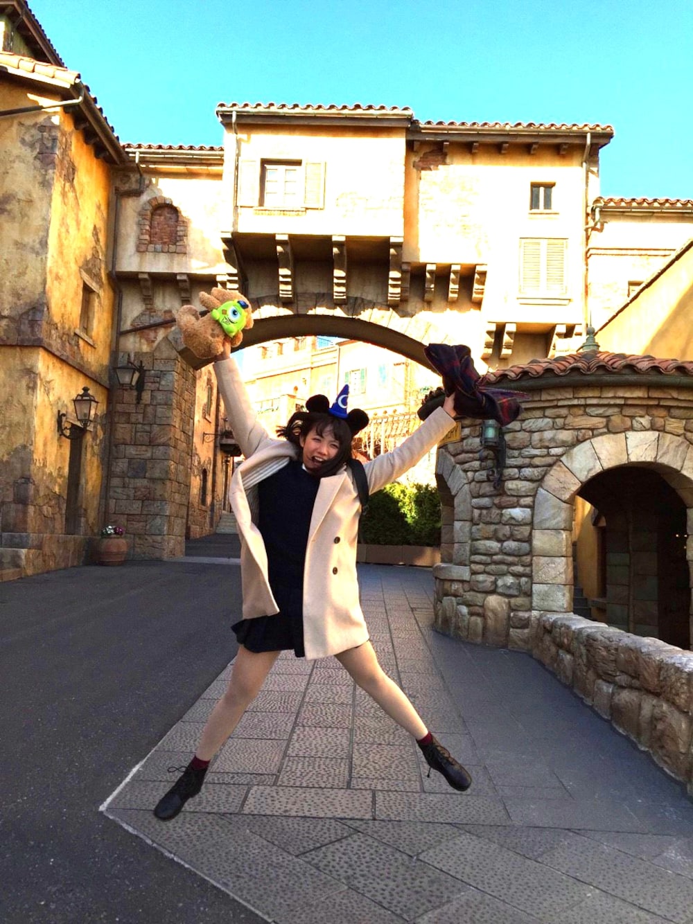 2日目、ディズニーシーにて撮りました! 素敵な街並みで、海外に来ているかのような 写真になりました! ジャンプに集中しすぎてダッフィー後ろ向いてる…笑 しかも太ももの筋肉がぼこっとなってるww