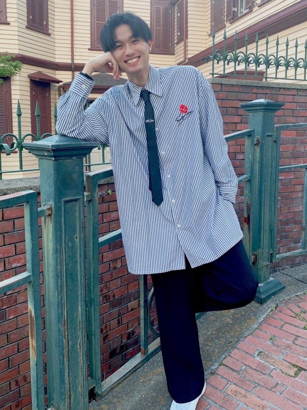 ナンバーナインのkeiくんとのコラボシャツです。 程よいオーバーサイズで胸元の薔薇がワンポイントです。 ネクタイはaliexpressで400円で購入しました!