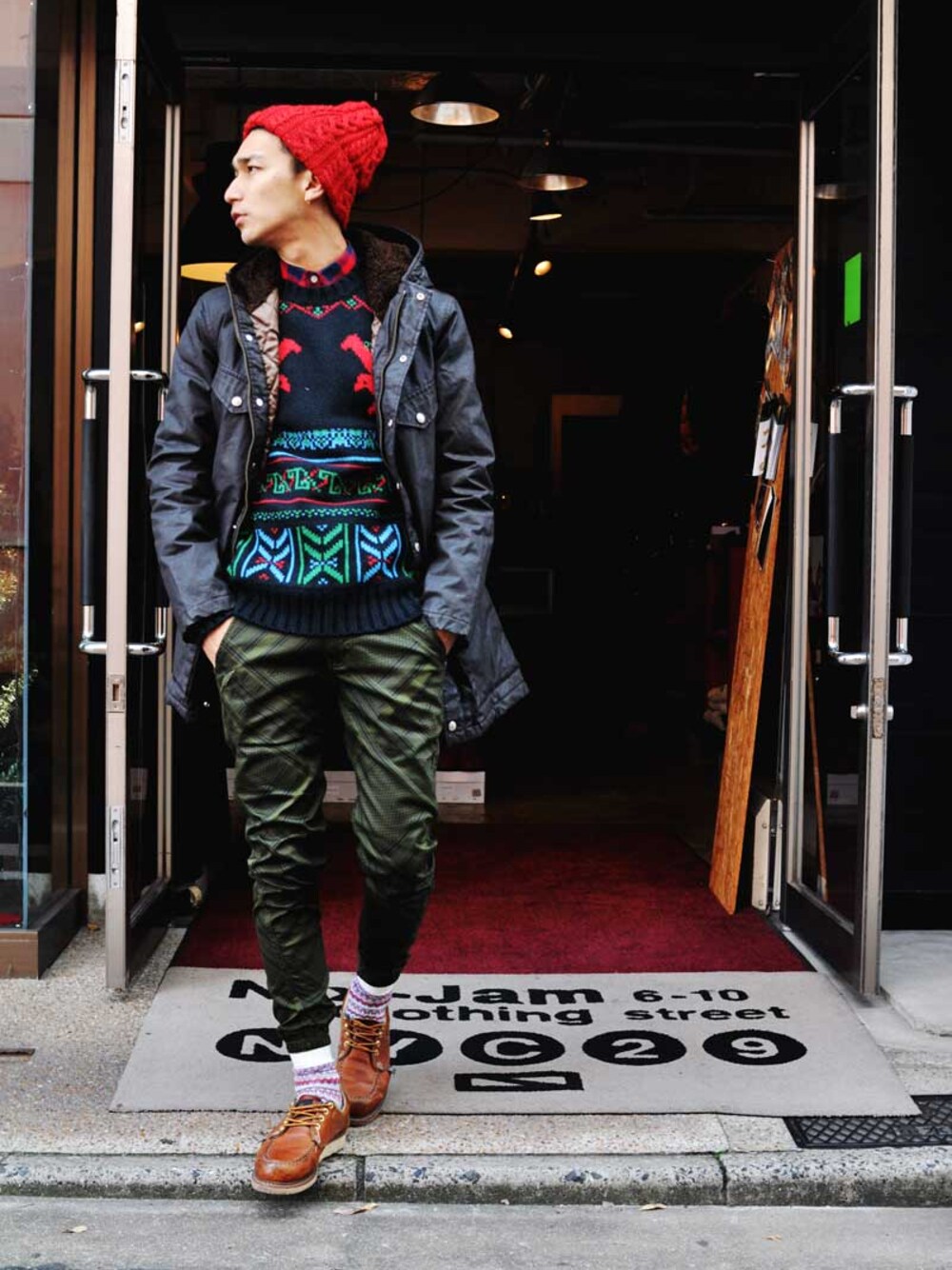 レッド系のニットキャップ/ビーニーを着用したメンズの冬コーディネートの1枚目の写真