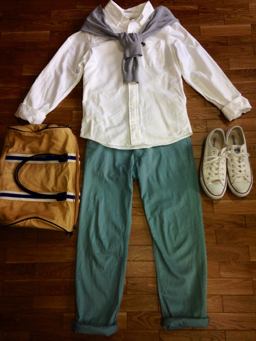 昨日の雨とは打って変わり、今日はいい天気です。気分も晴れやかにするために明るめのコーディネートにしました。カラーパンツに白シャツは鉄板です。+αとしてカーディガンを巻いてみました。 バッグはなんだかんだで高1の時から使ってます笑 白のコンバースも使い勝手がいいです。 それではまたヒマな時に更新します。