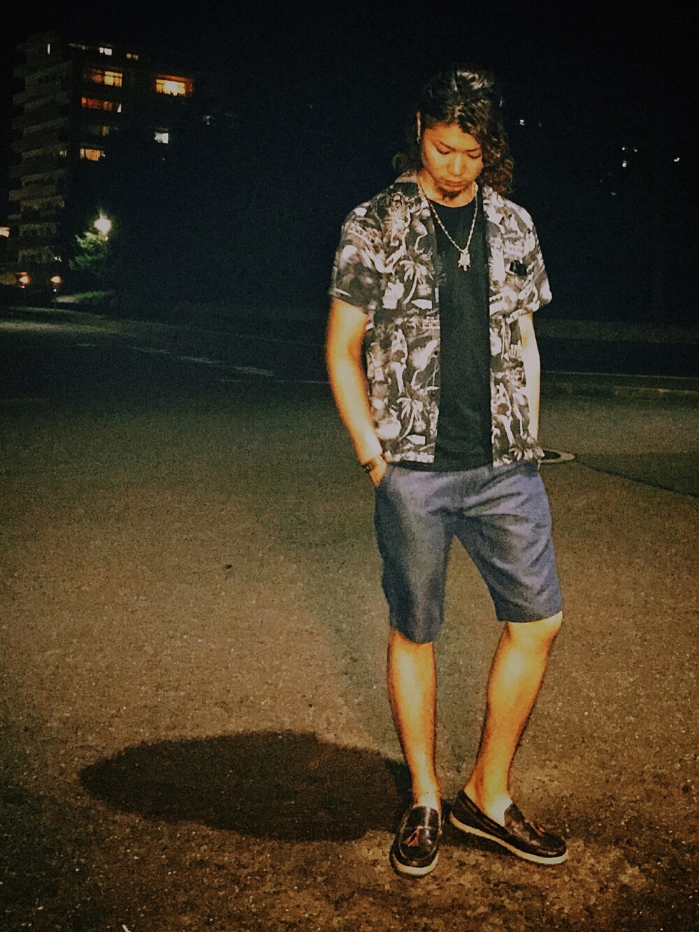 夜になっても暑い日が続きますね(TT) そんな夏の夜はアロハシャツに限ります! 黒系のアロハシャツに黒いインナーでは強い印象になってしまいますので、麻素材のブルー系のショーツを合わせることで印象を柔らかくしています。 デッキシューズを合わせる事でサンダルよりも都会的な印象を与えています。 シャツ Mサイズ Tシャツ Mサイズ ショーツ Mサイズ