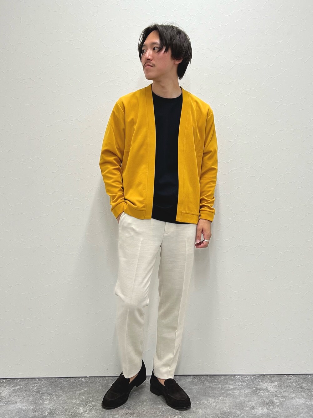機能素材を使ったシンプルアイテムを展開するACTIVE SECTを使用したカジュアルコーデ からし色に近いイエローカラーのカーディガン 発色が強すぎないのでコーディネートに取り入れやすいです ボタンレスでスッキリした印象に インナーにはソロテックス素材使用のストレッチ性と形態安定を合わせ持つきれいめTシャツ ハリもあるので、1枚で着ても様になりやすいです ヘタレにくい万能Tシャツおすすめです 着用サイズ カーディガン:Mサイズ Tシャツ:Mサイズ パンツ:Mサイズ 身長169cm,体重56kg,細身体型 Instagram @shin_nol