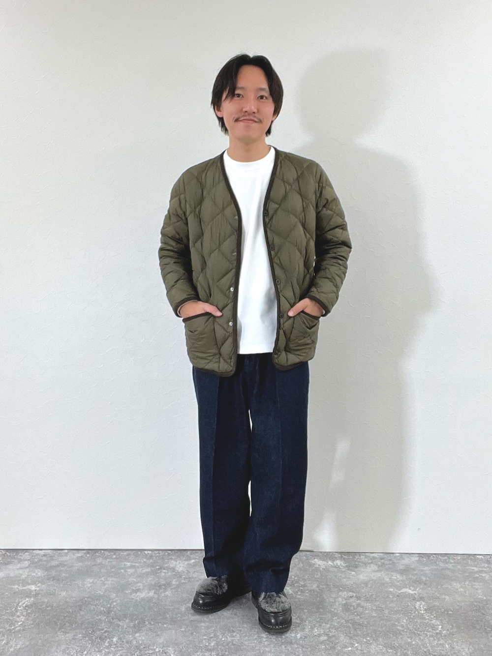 nishiokaのダウンジャケット/コート「【TAION/タイオン】別注PIPING V NECK DOWN CARDIGAN 24AW」を使ったコーディネート
