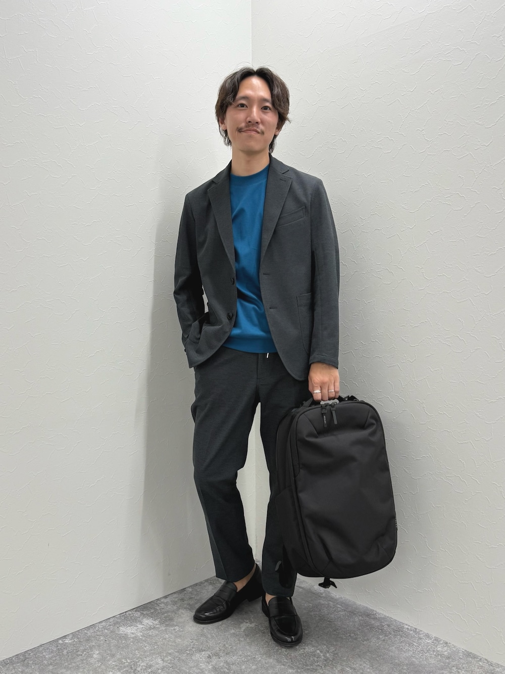 夏のセットアップコーデ 定番ドレスTシャツに新色が入荷! 深みのあるブルーカラー 一枚でも様になる色味です セットアップはシャリ感のあるドライタッチなイージーセットアップ ミディアムグレー×ブルーでまとめました バッグはWEXLEYのTAYLOR コンパクトなサイズ感ながら、3層式で容量も大きめで今人気のバックパック 着用サイズ ジャケット:Mサイズ Tシャツ:Mサイズ パンツ:Mサイズ 身長169cm,体重60kg,細身体型 Instagram @nishioka_nol