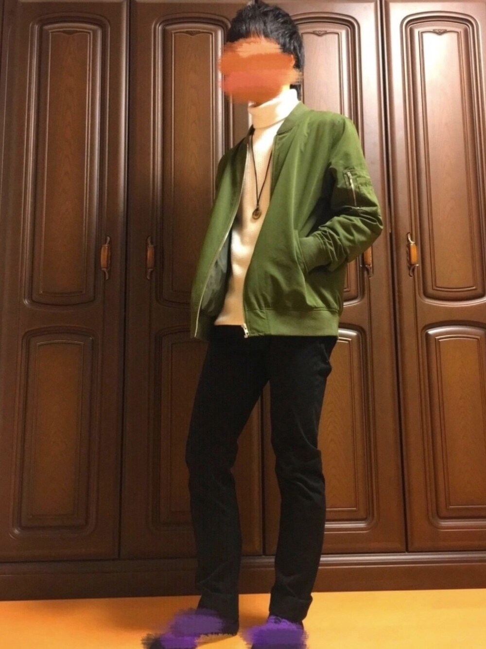 タートルネックとMA_1を組み合わせました。 家で靴は履かない主義です。