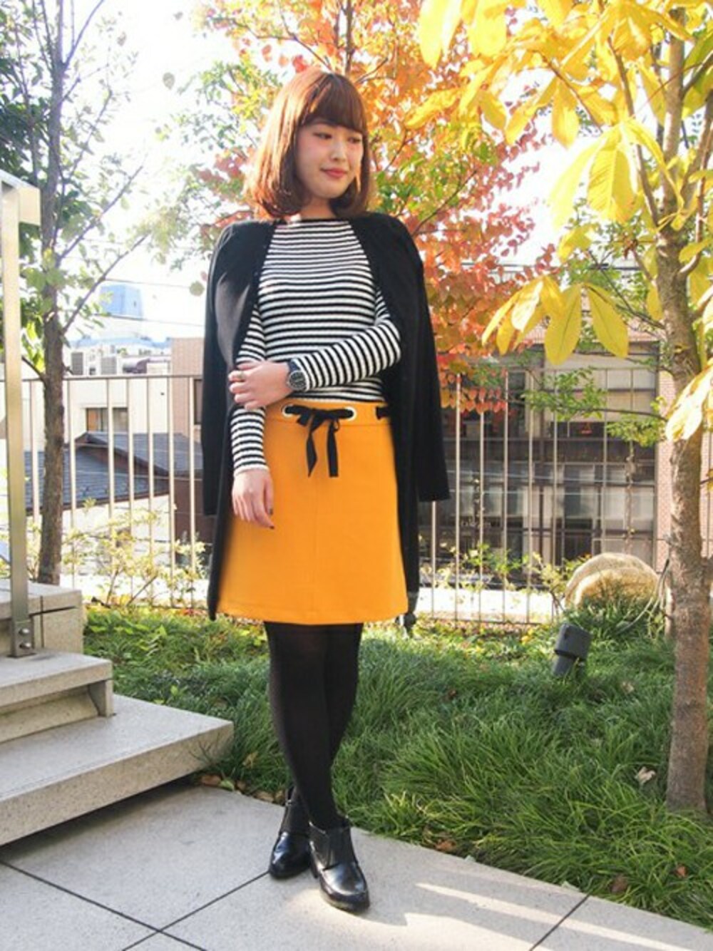 yellowのスカートが印象的な大人カジュアルなスタイリング♡ ポイントは何と言ってもスカートのイエローカラー。ベルト部分は紐デザインで トップスをINすると可愛さがUP! 着心地◎なボーダーのトップスは着回し力抜群でデイリー使いにおすすめ☆ 足元はショートブーツでスタイルアップに★
