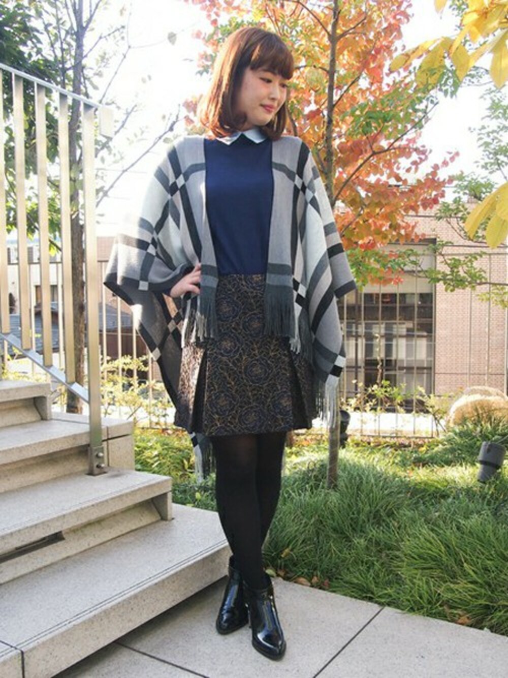 ネイビーでまとめたコーディネートにチェックのストールがポイントになった 大人カジュアルなスタイリング♡ トップスは襟付き♪ 印象的なレースの柄のスカートは1枚取り入れるだけで華やかな印象に! 足元はショートブーツでスタイルアップにも★