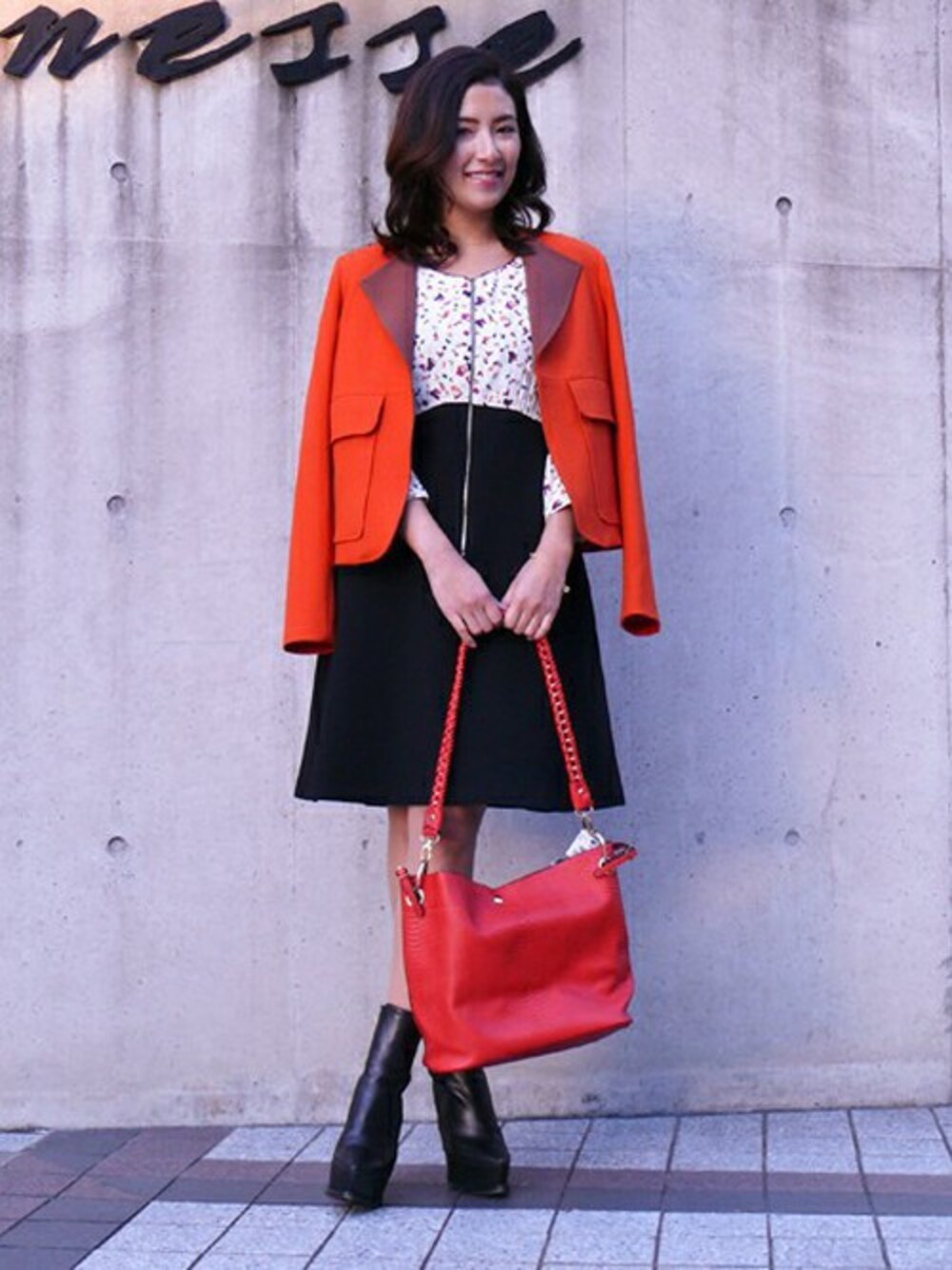 オレンジのジャケットがポイントになった甘辛MIXコーディネート♡ パキっとした印象のジャケットもワンピースと合わせれば かっちりしすぎない着こなしに♪ ワンピースは胸下からの切り替えでバランス◎! 可愛くなり過ぎないワンランク上のワンピーススタイルです♡