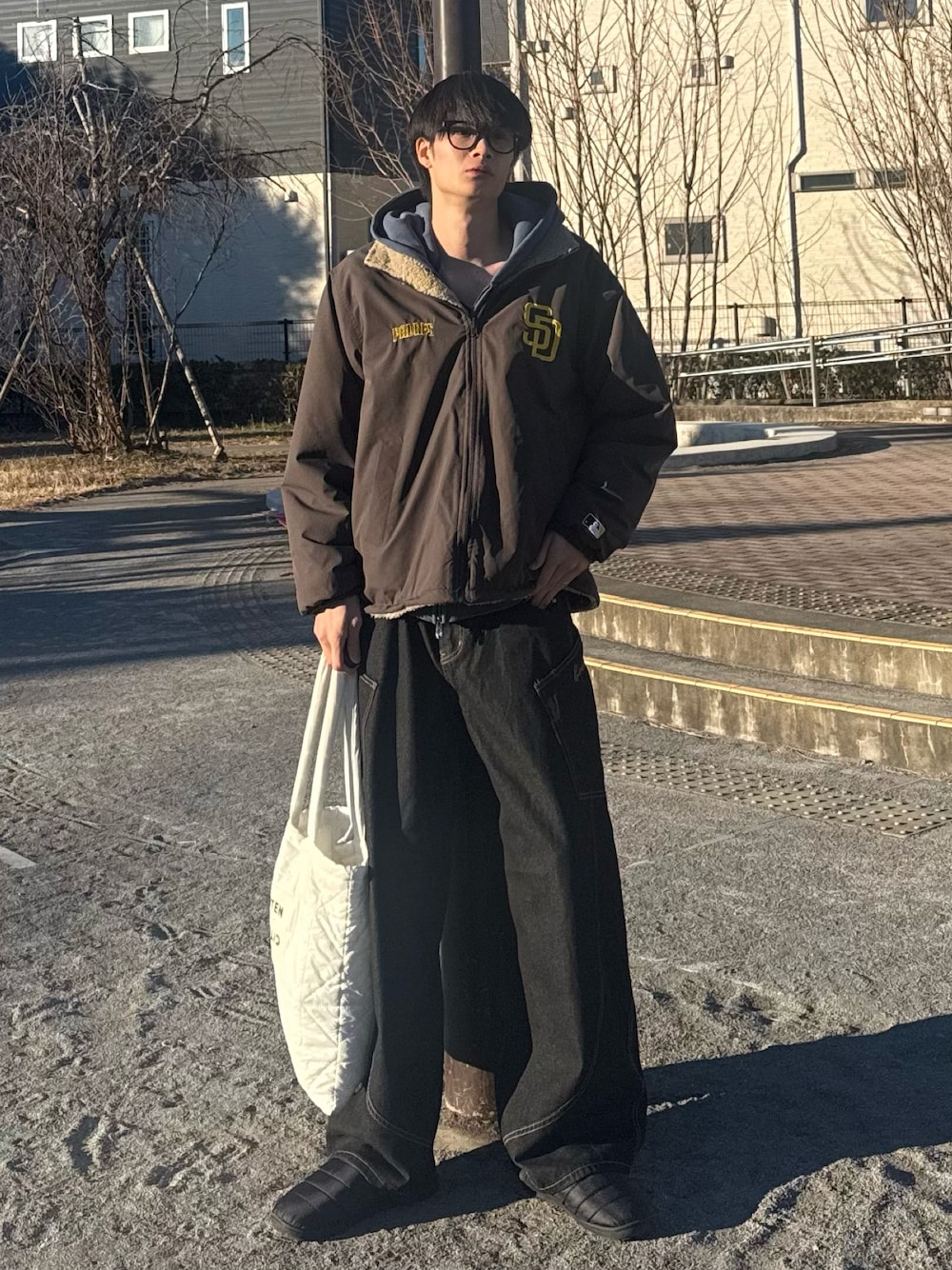 亮.のブルゾン「MLB/メジャーリーグベースボール 別注 ワッペン刺繍 2WAYリバーシブル ドロストナイロン×ボア スタンドブルゾン」を使ったコーディネート
