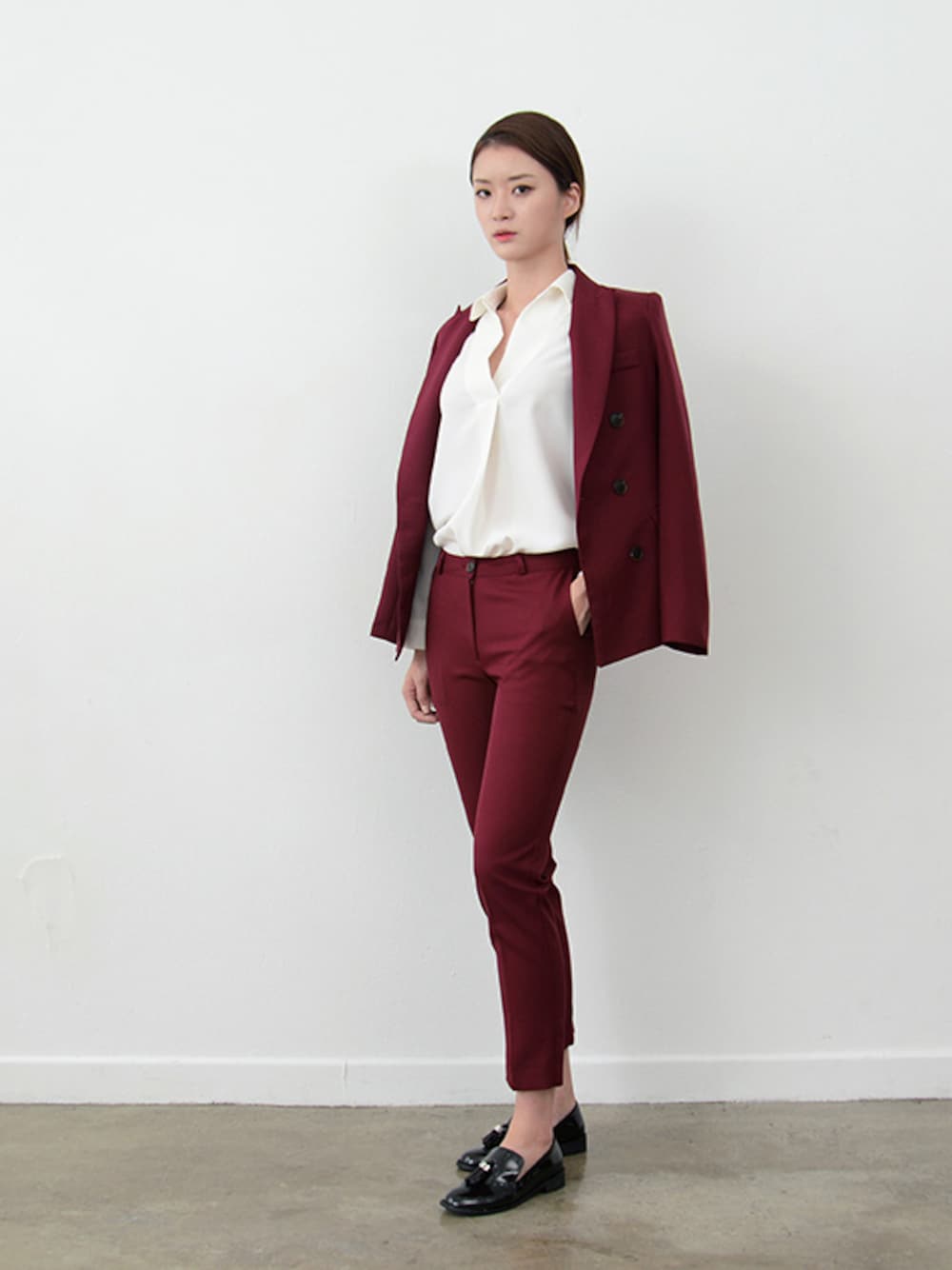 「現在SINOWS Suits 10%OFFイベント中」 ▴アウター:wine double jacket ▴ブラウス:stella blouse ▴ボトムス:wine slacks 成熟したワインのようなディープボルドー色のスーツ。 フェイスラインをキレイに見せてくれるテーラード襟が特徴のジャケットはスリームフィットスラックスとのセットアップで完成度の高い大人女性の着こなしを楽しめる。
