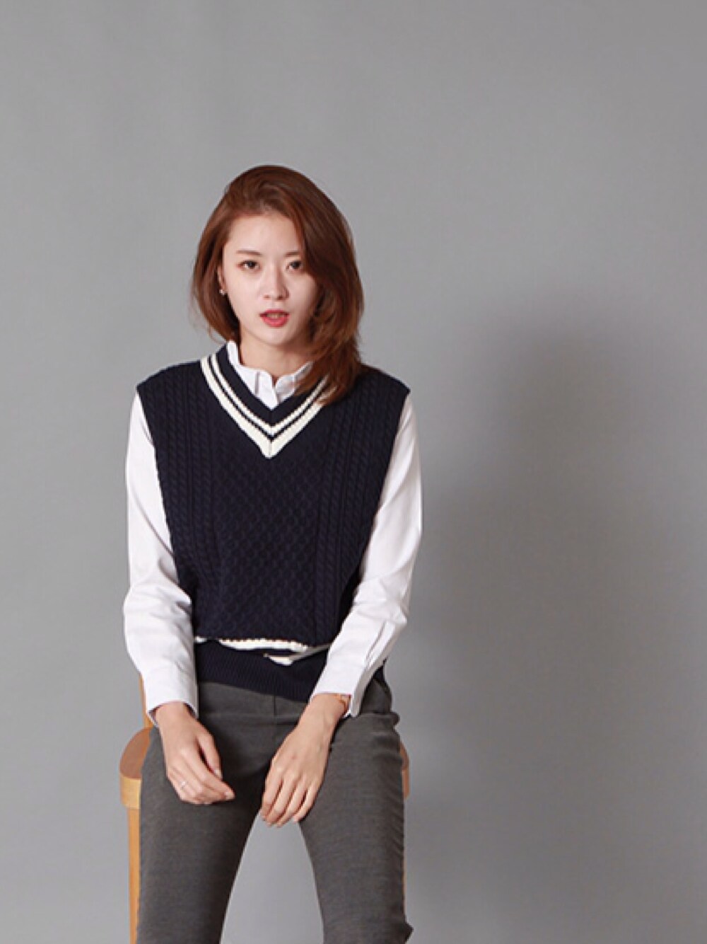 ▲oxford shirts ▲preppy vest ▲gray daily slacks クリケットベストでクラシックなプレッピールックを演出しました。