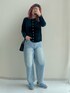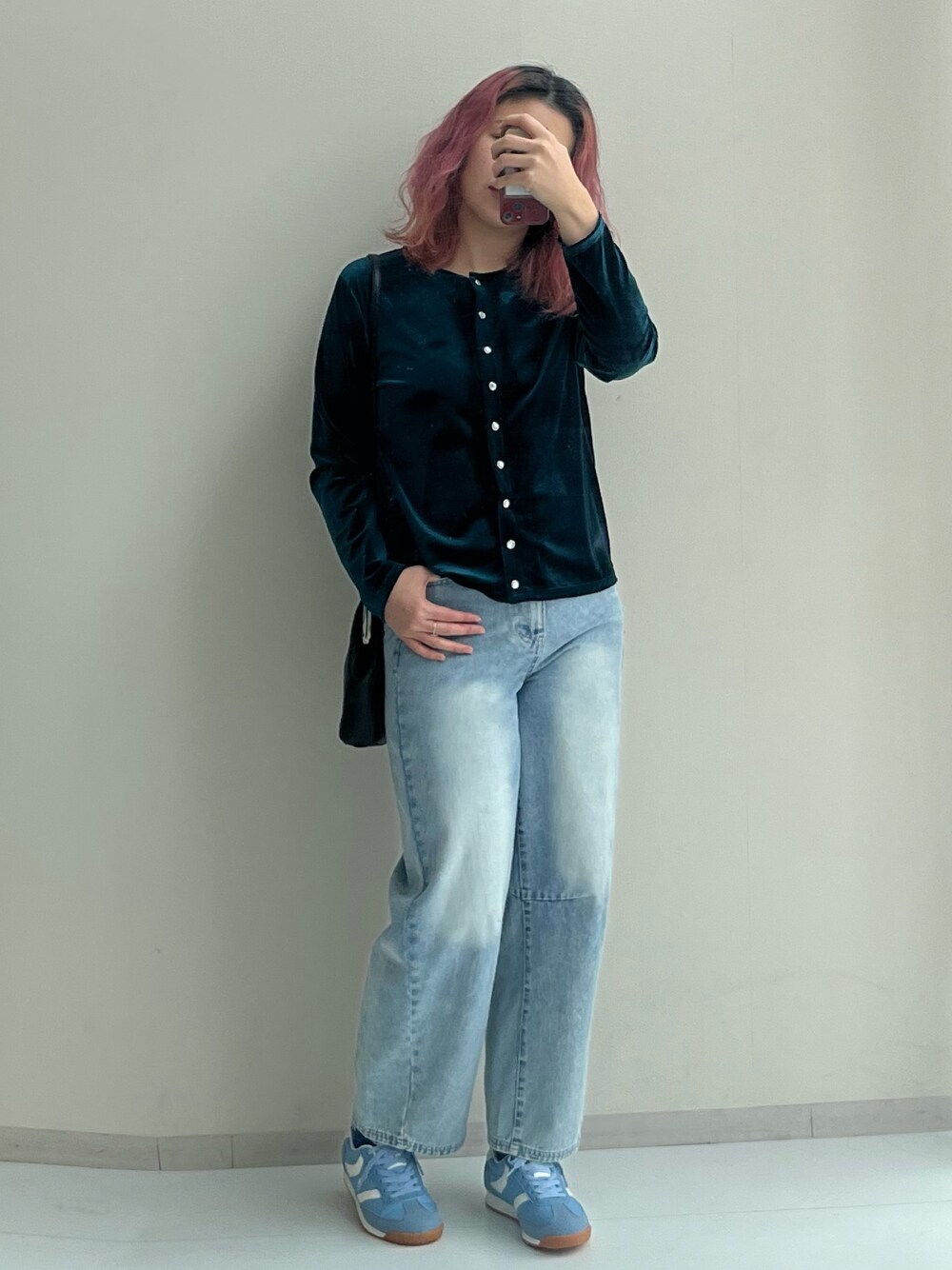167cm 骨格ナチュラル 【トップス】Mサイズ ・ベロア素材のカーディガンをトップスとして着用 ・特有の光沢感とこっくりしたグリーンが、デニム合わせでも上品に見せてくれる♡ ・ボタンを全部閉めて着ることで、クラシカルでレディな印象に! 【ボトムス】Mサイズ ・骨格ナチュラルさんの大本命!ワイドシルエットの淡色デニム ・太ももに入ったウォッシュ加工が立体感を出してくれて、のっぺり見えない◎ 【バッグ】 ・コーデをキリッと引き締める黒のショルダーバッグ ・肩掛けすることで縦のラインが強調され、横からのシルエットもスッキリ 【シューズ】 ・デニムと色味をリンクさせたブルーのスニーカー ・足元をあえてスニーカーでハズすことで、ベロアのドレッシーさを日常使いに落とし込む◎