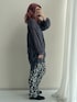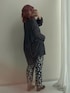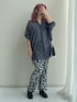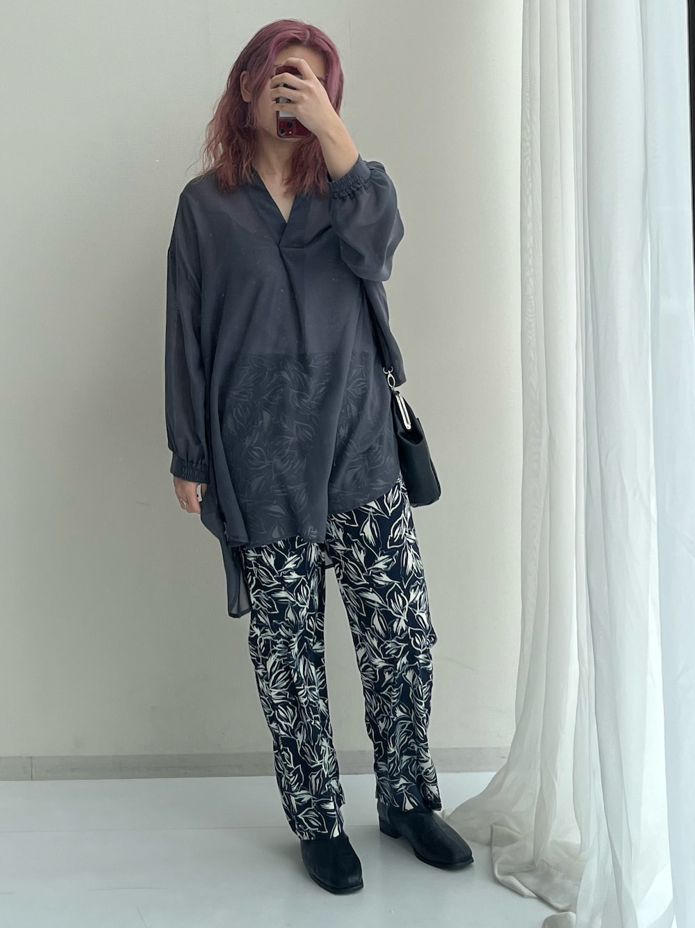 167cm / 骨格ナチュラル トップス:Mサイズ • 絶妙なチャコールグレーのシアー素材が、重くなりがちなモノトーンコーデに軽やかさと「抜け感」をプラス。 • 袖口がすぼまっているので、腕を出すコーデもできる。 • お尻まですっぽり隠れるチュニック丈は、高身長さんの「縦のライン」を強調し、骨格ナチュラルのフレーム感も優雅にカバー。 ボトムス:Mサイズ • 白地に黒の大胆なボタニカル柄が目を引く、主役級のワイドパンツ。 • 骨格ナチュラルさんが最も得意とするワイドシルエットで、下半身のラインを拾わず、スタイルアップ効果は抜群。 • フルレングスの丈感が167cmの高身長を最大限に活かし、Iラインシルエットを美しく完成。 バッグ • 小ぶりなブラックレザーのバッグを斜め掛けにすることで、コーデ全体をきゅっと引き締め。 シューズ • コーデのテイストに合わせたスクエアトゥで、モード感をプラス。フラットシューズを選ぶことで、ラフな「ハズし」を効かせている。