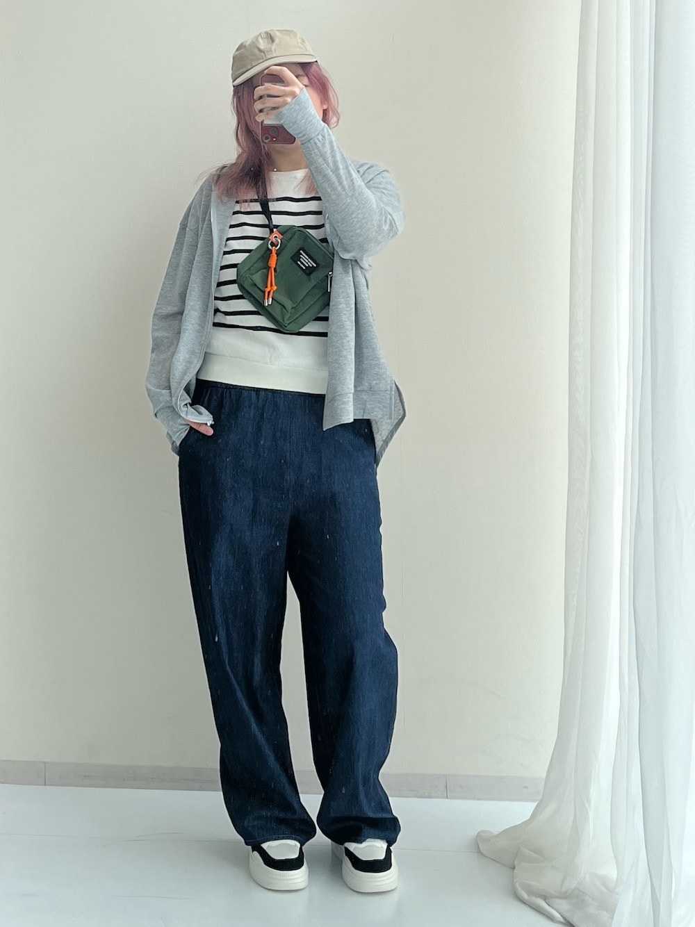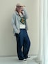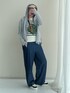 167cm / 骨格ナチュラル パーカー:Mサイズ • 前から見るとシンプルなグレーのパーカーですが、後ろ姿はプリーツ仕様でかわいい♡ • 袖口には指穴が付いており、手の甲までしっかりカバー。春先の紫外線対策や、自転車移動時の保温性もバッチリです。 ・骨格ナチュラルのフレーム感を拾わない、ゆったりとしたサイジングも絶妙。 トップス:Mサイズ • 顔まわりを明るく清潔に見せる、白ベースのパネルボーダー。 • Tシャツのようなサマーニットでシンプルだけど、コーデが決まる◎ ボトムス:Mサイズ • 潔い太さのワイドシルエットが、しゃがんだり走ったりも動きやすい! • 濃紺(インディゴ)カラーは、砂汚れなどが目立ちにくいだけでなく、全体を膨張させず大人っぽく引き締まった印象に。 バッグ • 両手が空く斜め掛けバッグで貴重品を入れられて必須アイテム。 ・カーキのバッグに付いた鮮やかなオレンジのコードが、最高にクールな差し色に! ・必要なものがさっと取り出せるサイズ感も◎