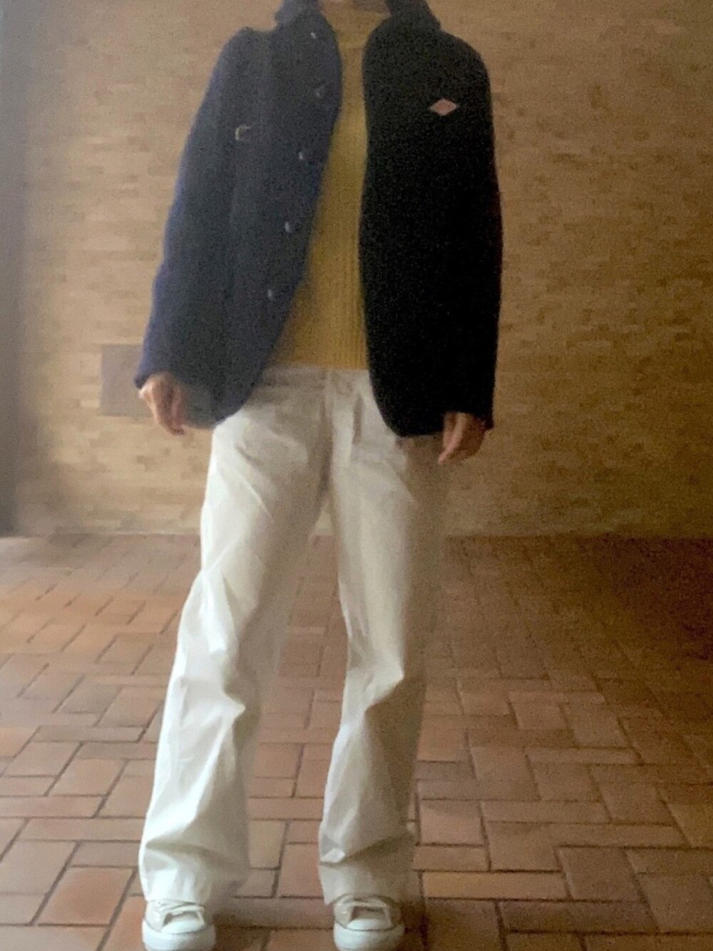 写真の写りが悪いですが、鮮やかなイエローのニットを着ています^ ^ ワイドパンツ、スニーカーだと少し子供っぽくなるので、レザー調のバッグを持ちました。 バッグはSpick &Spanのムック本のものです。サイズ感がちょうど良くて、プライベートにも仕事にも活用しています*
