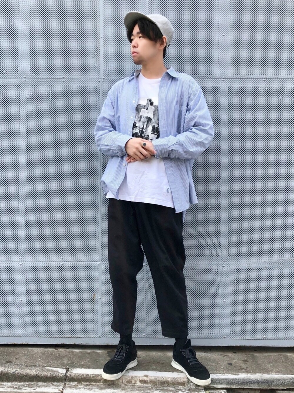 ストリートカジュアルの30代前半 プリントロンTをメインにしてコーデを組んでみました! 太いワイドパンツをくるぶしにして足首を細く見せてメリハリをつけているのもポイントです!