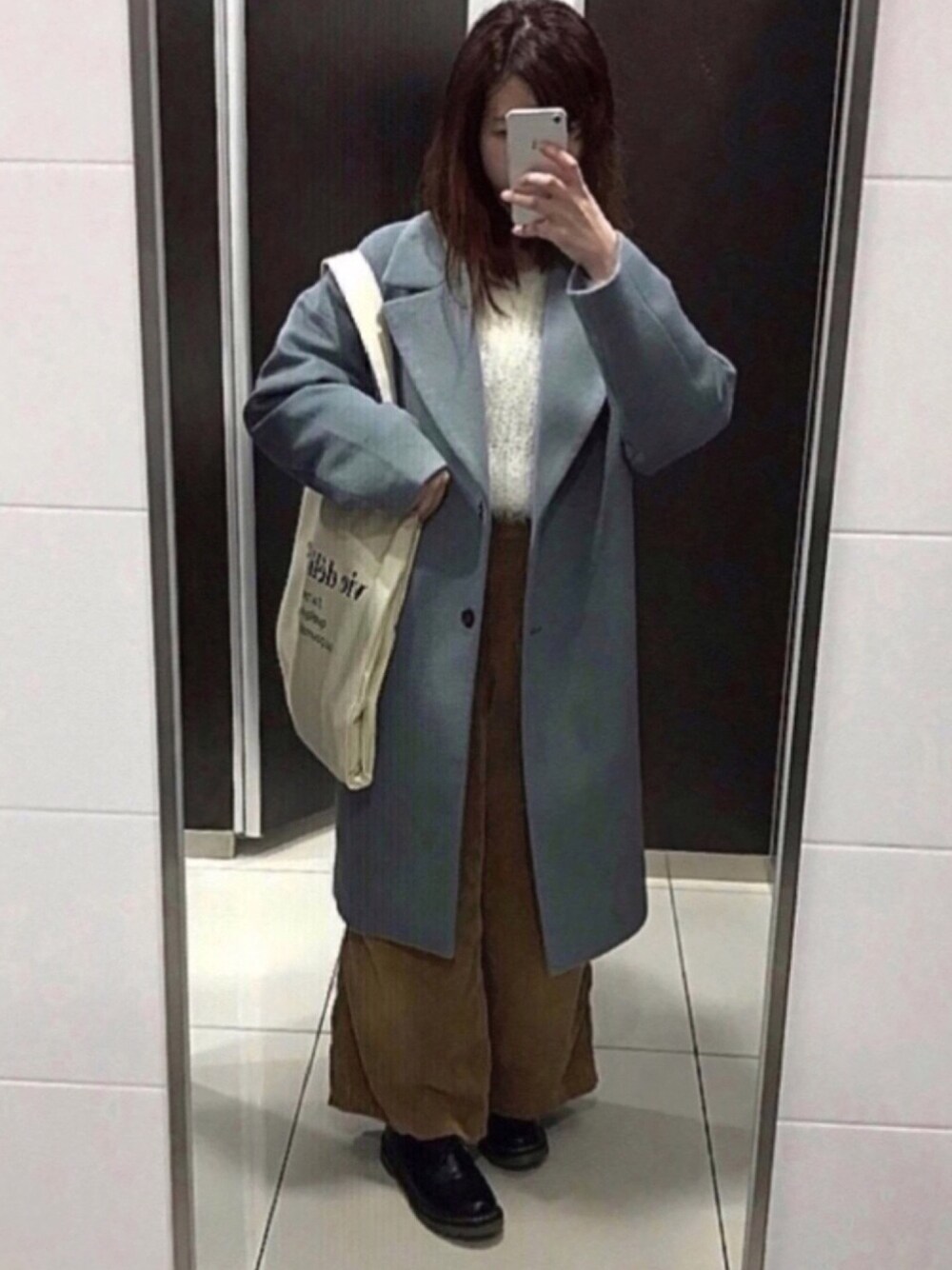 今季のGUのウールブレンドチェスターコートのくすんだ水色の色味(表記ではグリーン)かつ、ドロップショルダーでややオーバーサイズな作りのところが最高です😍写真どおりの落ち着いた色味なのでなんにでも合わせられそうです😌特にブラウンと相性いい🤤 雪本降りになる前にこのコーデでローファーとも合わせたい履こうかな🤔(持ってない) トップスのシャギーニットは頂きものです☺️ 下はコーデュロイのワイドパンツです
