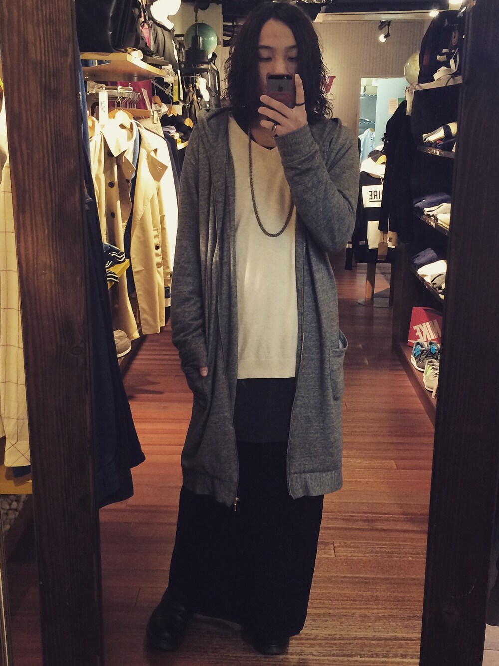 ユニセックス感を出したい時のコーデ。 黒のロングスカートはスリットが大きく入っているのでスキニーを見せてモード感を強くしました。