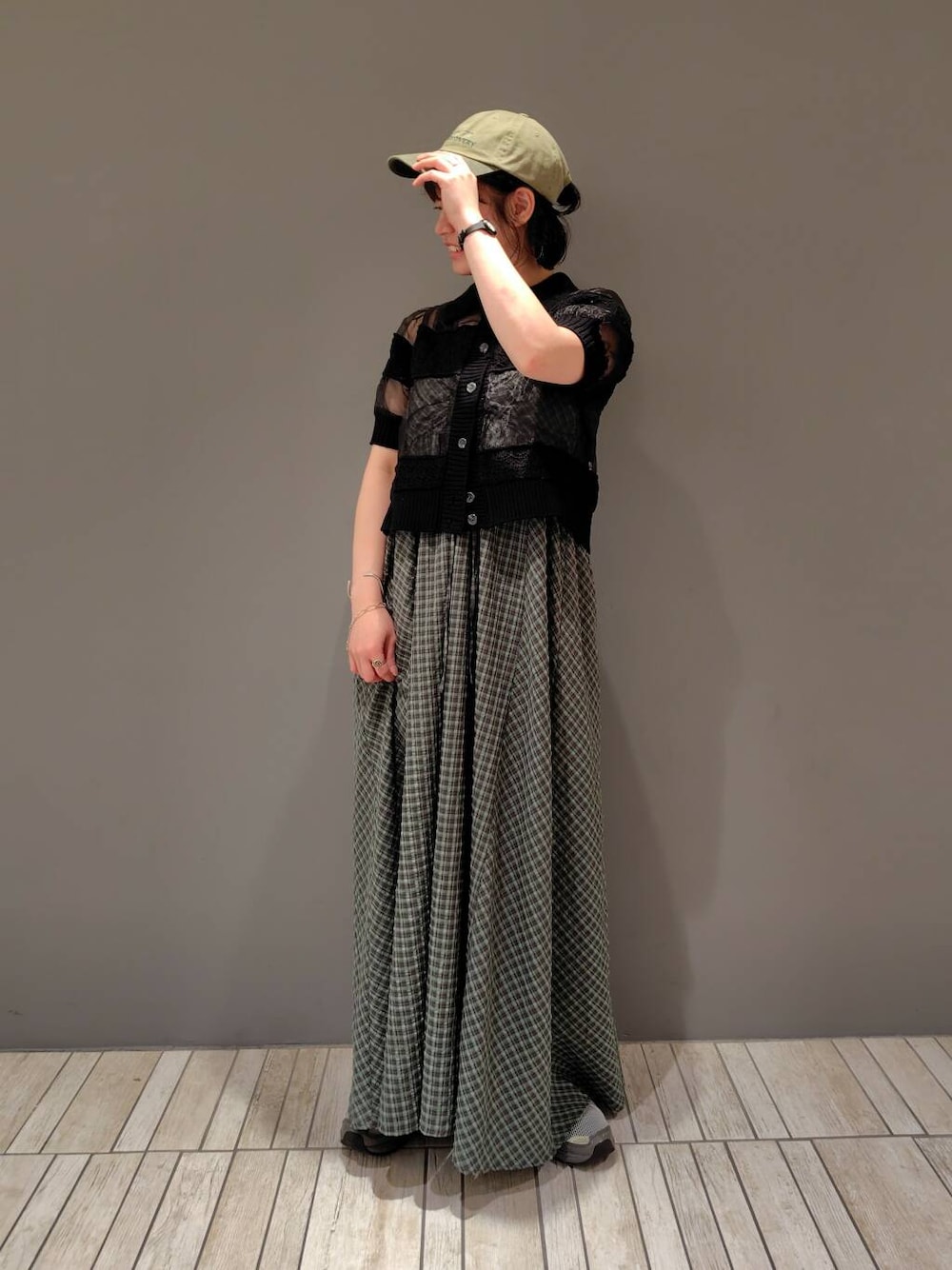 まるのワンピース「ドロストチェックキャミワンピース」を使ったコーディネート