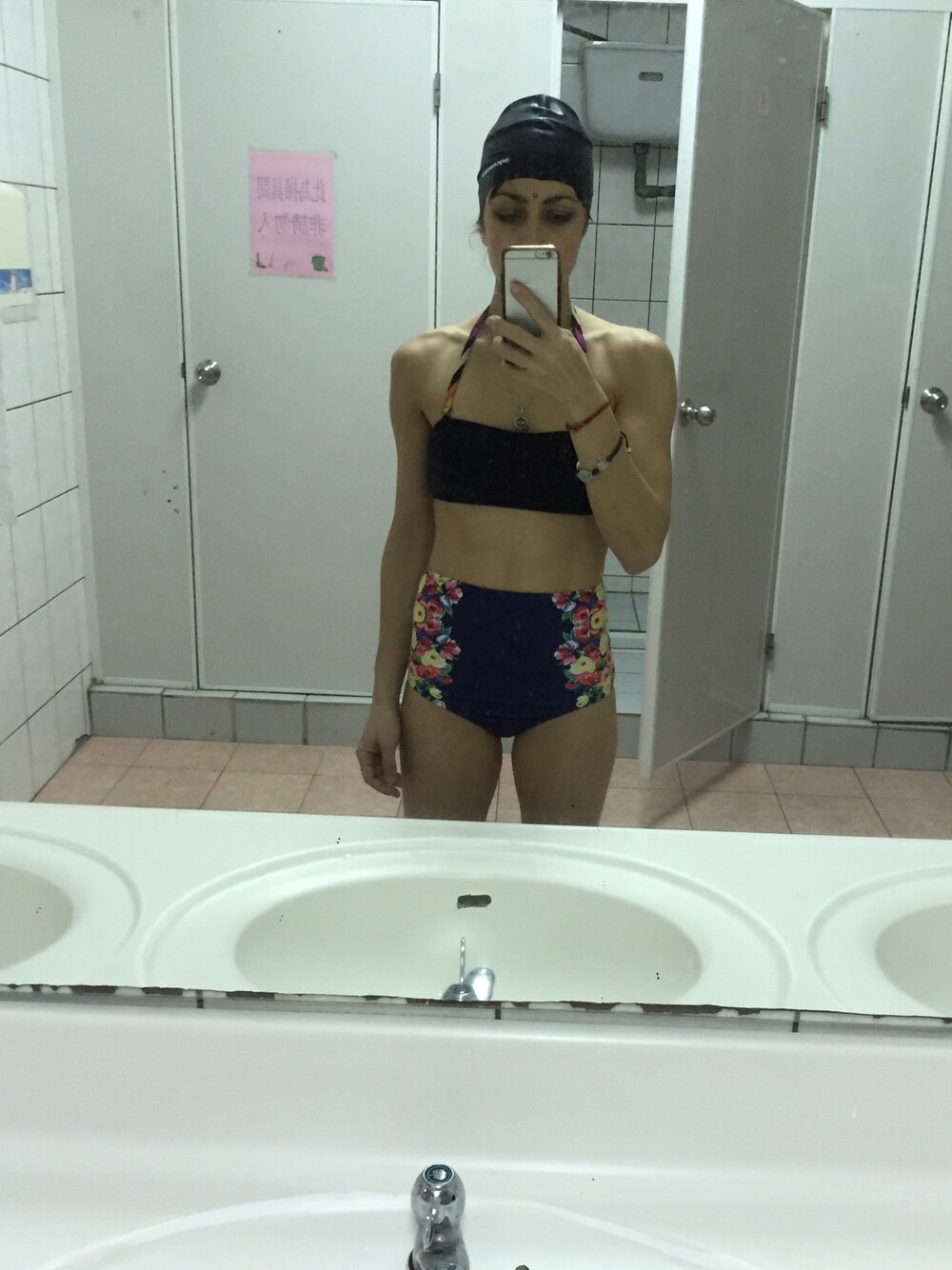 For a vintage swimming session and not hipster. Mix a bottom high rise 50s swim style with floral later prints and a plain top. Very kitch