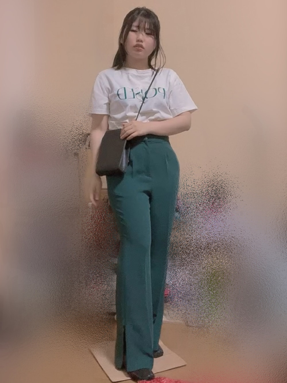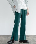 apart by lowrysのスラックス、裾部分がチャックでスリット長さが変えられるんです✨ シャツを羽織ったり、Tシャツと合わせたりしてもGOOD🙆♀️ 鮮やかなグリーンが可愛いです💞 丈が長いのでシースルーブーツと合わせました😉