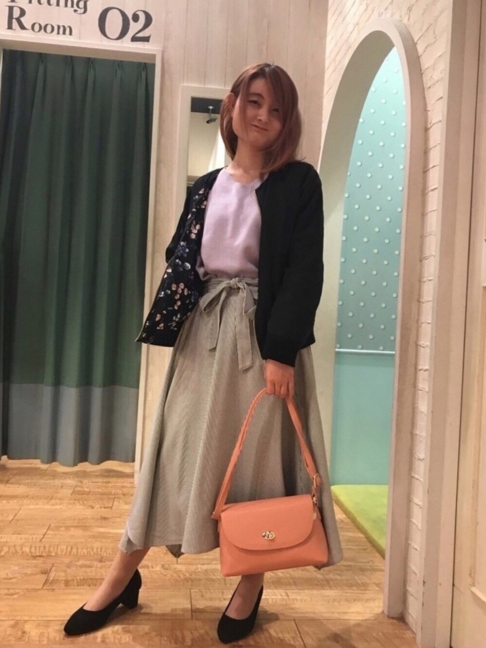 本日2回目の投稿です(´>ω∂`)☆ 今回は、キレイめコーデにしました! 中のトップスはラベンダー系のお色で 桜色っぽくなり春らしくなります🌷🐝… ジャケットはリバーシブルになっており その日の気分で変えて着て頂けますよ〜😄♪。.:*・゜ 着回し力抜群(✌゚∀゚)☞ すっごく便利です☆ スカートはボリュームのある 尚かつシルエットも気にせず着て頂ける ようになっております🙂! 今回はストライプでジャケットのお色を 黒にすることにより かなり縦のラインがスッキリしますよ〜😊💟 小物のバッグを小さめにすることで 小柄な方でもスッキリとして見えるように なっております(⊃´-`⊂)💕 誰でも真似できるコーデ となっております!😄 是非着て見てくださいね〜🙈💕