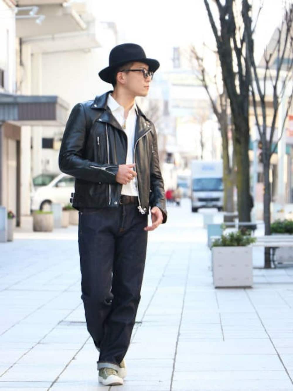Lewis Leathers カジュアル&ドレススタイル ルイスレザー永遠のスタンダードモデルである "LIGHTNING(ライトニング) ややシンプルめに仕上げた"402T"はダブルライダースの中でもコーディネートで万能に着て頂けるモデルです。 今回は極力、誰でも手に取り入れやすいスタンダードなアイテムで合わせたコーディネートです。 ブラックレザーと白シャツの色合いでコントラスト付け、RULERのMTF ルーズフィットデニムを合わせる事でキメ過ぎないカジュアルさを加えた合わせ方です。 最後にハットをワンポイントとして加えるのもおすすめです。 スタンダードな合わせ方こそ、揺るぎない格好良さがありますね。