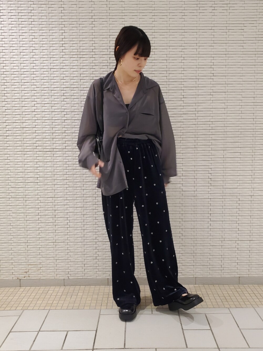インナーもブラトップで抜け感、 ボトムはベロアシリーズの柄で秋らしさも足してみました! シャツは着心地抜群一度試してみてください!