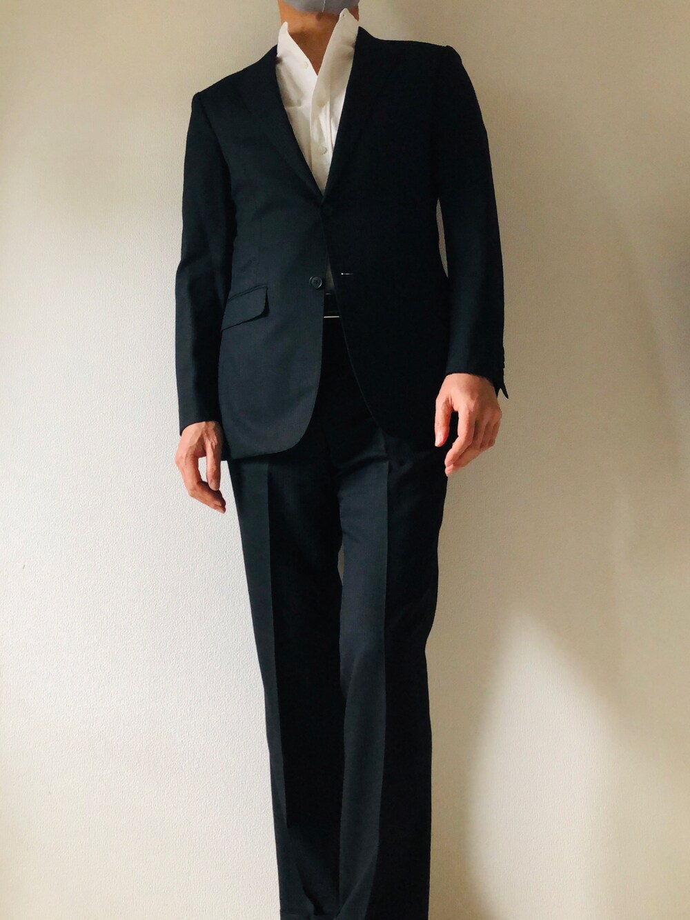 スーパーシンプルスタイル スーツのラインを活かすのみ バンドカラーでオリエンタルに 下からショットで脚長効果出してますが実物こんなに脚長くありません すみません🥴