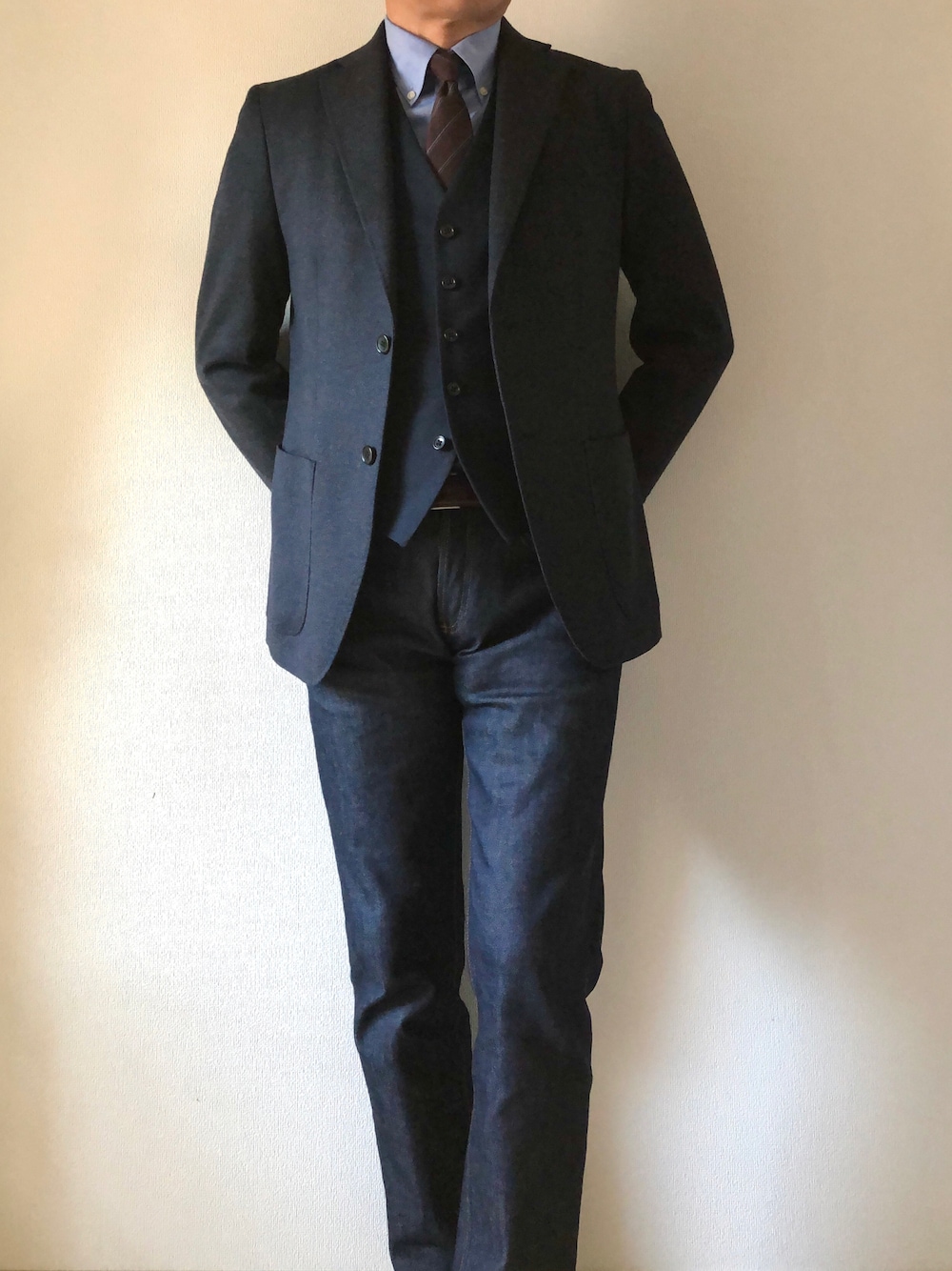 <デニム テーラードスタイル> お気に入りのAPCで☺️ ユニクロさんのスリムスーパーノンアイロンシャツは生地感、発色、このお値段優秀すぎです。
