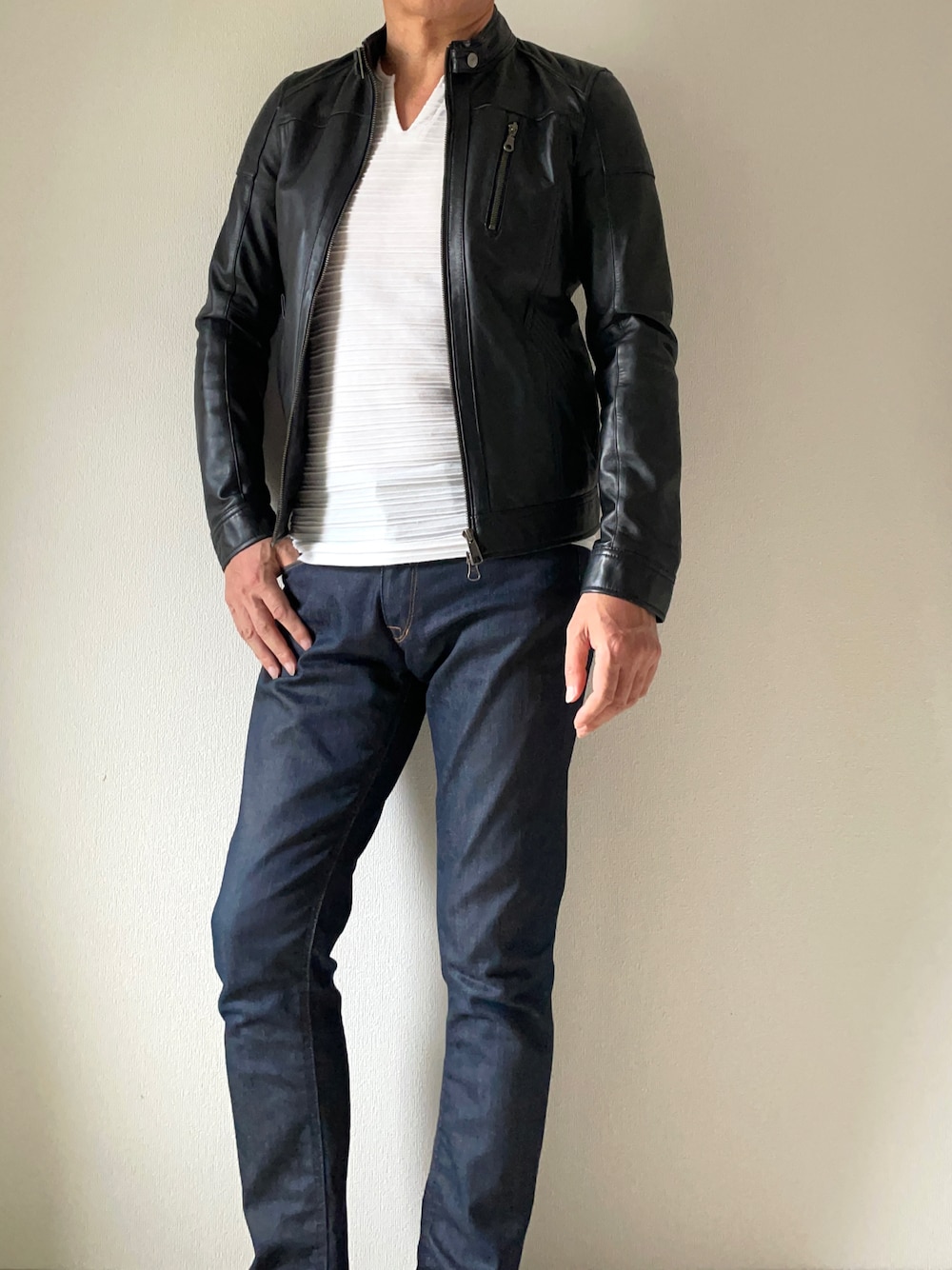 「量産型」ですがやりたかったヤツ🥴 スリムデニム×白T×シングルライダース シングルライダースといえば亡くなられた三浦春馬さんのキレイ目ライダーススタイルカッコよかったなあ🥺