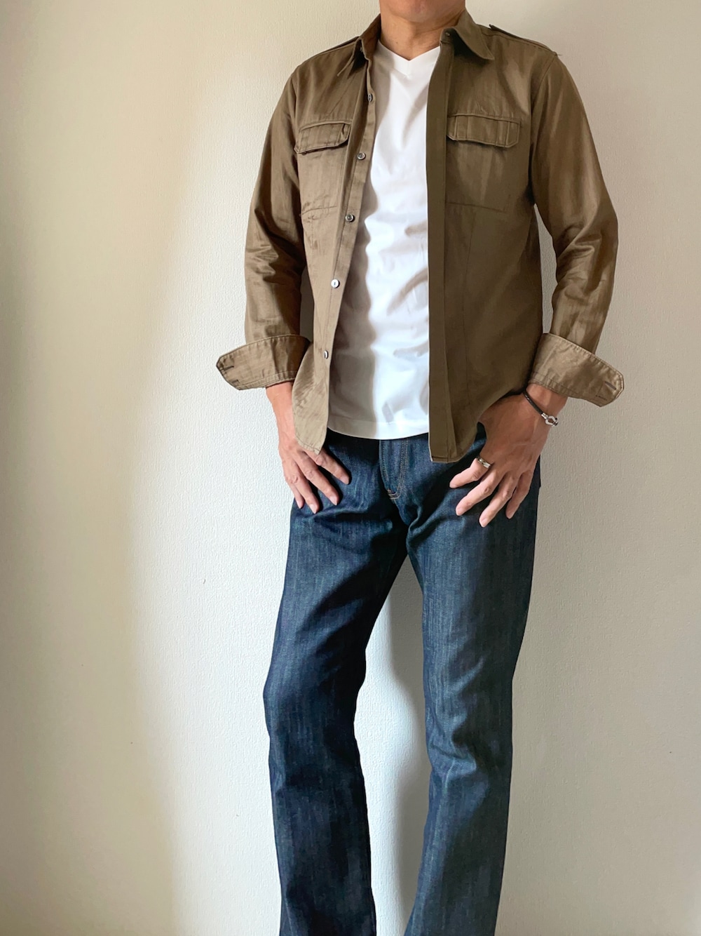 <秋色コーデ> ミリタリーシャツをジャケット使いで 気温も落ち着き出したので色落ちお気に入りデニムを引っ張り出す☺️
