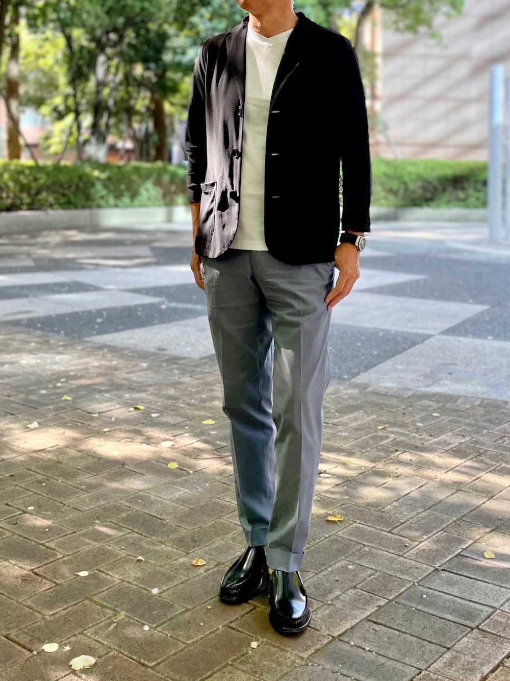 V::roomのニットアンコンジャケット ストレッチ素材で風が抜ける生地 カーディガンやシャツのように着れてかなり快適☺️ とりわけ男版シースルーといったところでしょうか