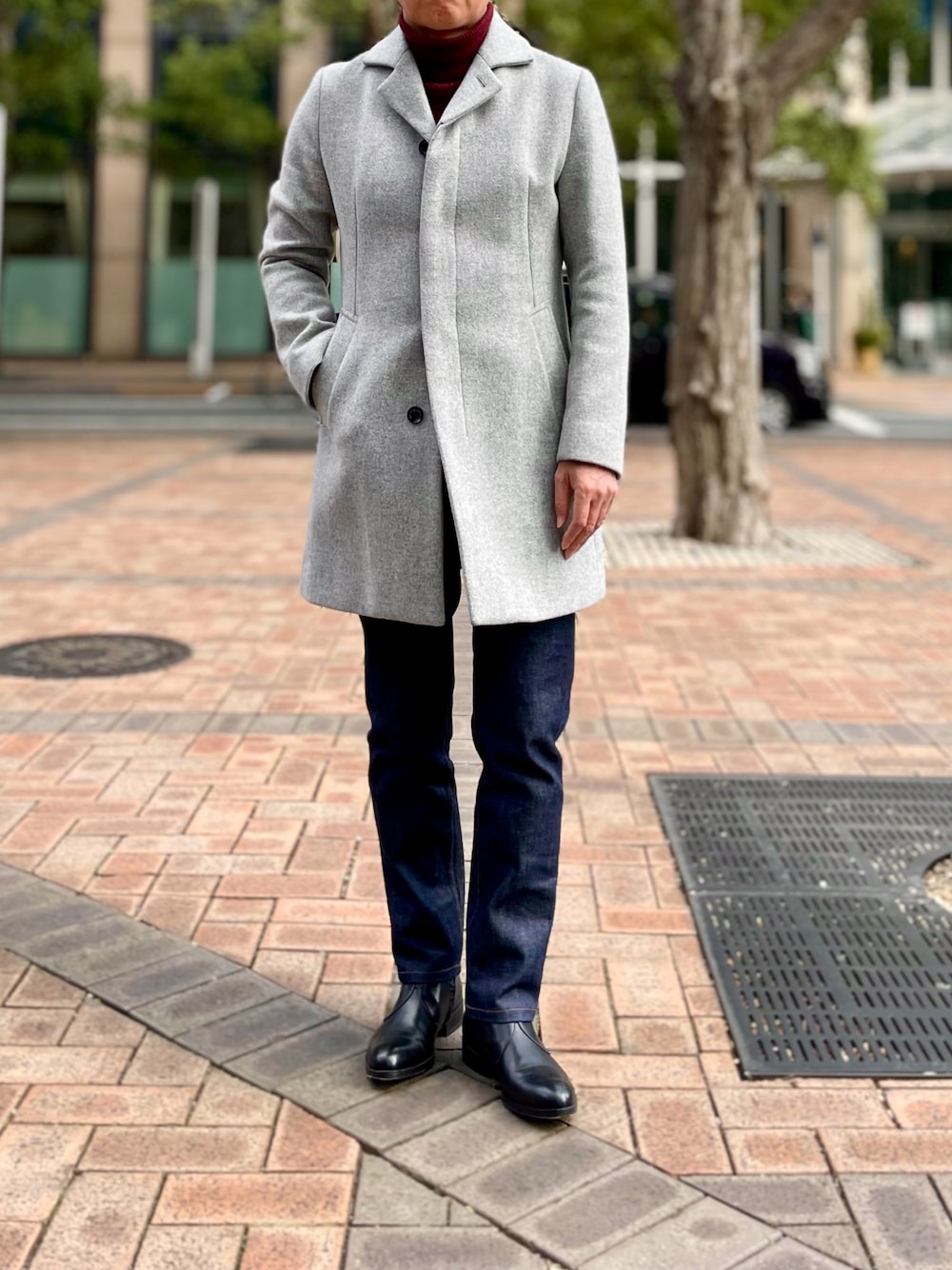 街散歩コーデ 差し色にエンジのニットを選択