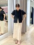 ・シアーボーダーシャツ 38サイズ着用 実際に購入しましたが、 サラッとした涼しい素材です。 袖は薄手の裏地がついているので、 洗濯後もボリューム感があります。 黒は透けにくく、 インナーの響きも心配なく着られます。 少しAラインに広がったシルエットで 羽織として着るのもおすすめです! 洗濯後のシワは気にならず、 アイロンなしで大丈夫です。 ・ラメリネンタイトスカート 38サイズ着用 実際に購入しましたが、 タイト過ぎないのでヒップのラインも気になりにくいです。 ラメ入りのリネン素材で、 シンプルなトップス合わせでも コーデのポイントになります! 深めのスリット入りなので歩きにくさはないです