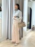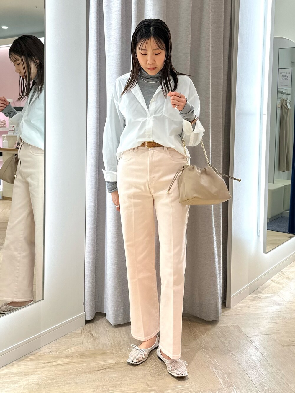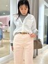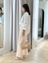 ・タイプライターシャツ オーバー過ぎないサイズ感で、 すっきりと着られます。 薄いタートルをインナーに入れても 窮屈さはないです。 着用しているように、 裏側に付いているボタンを止めていただくと インしているかのようなデザインになります! ベーシックなデザインなので、 着回し力抜群です。 ・センタープレスハイウエストデニム サイズL着用 ピタッとし過ぎず脚のラインを拾わない サイズ感で安心感があります。 とても柔らかく、軽い履き心地で シーズンレスで着ていただけます。 裾が少しフレアになっており、 程よくコーディネートのアクセントになります!