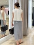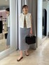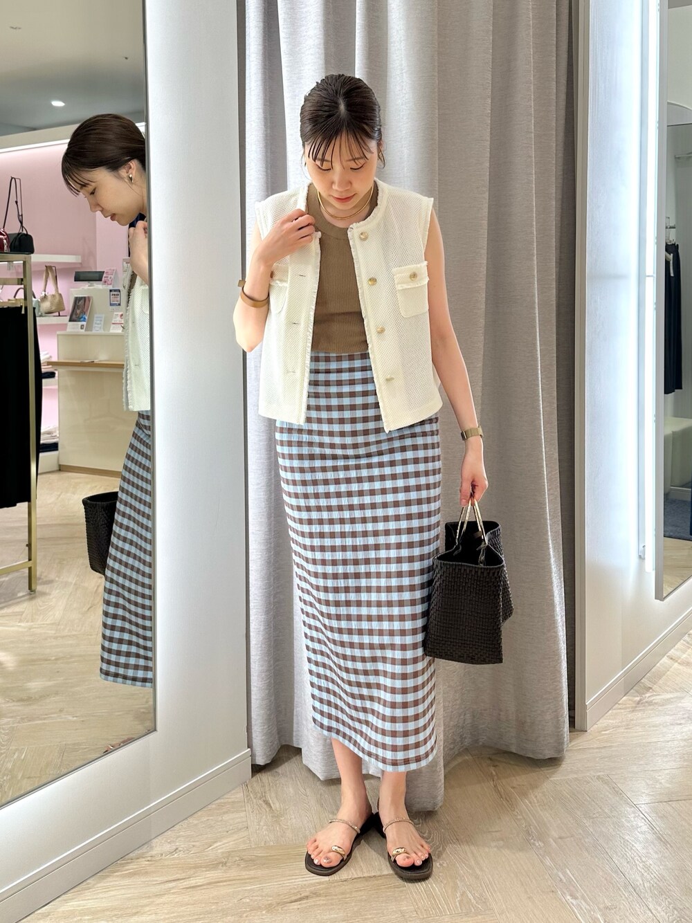 ・ラッセルフリンジベスト とても軽く、夏におすすめのベストです。 TシャツやロンTなど袖ありトップスとの 合わせもおすすめです! 着丈は短めですが、 高身長の方でも短くなり過ぎずに着られます。 ・ギンガムチェックタイトスカート 38サイズ着用 ストレッチが効いており、 タイトの割には歩きやすいです! ウエストにゴムは入っていないので ヒップ周りはすっきりとしたシルエットになります。 薄手の素材ですが、裏地付きなので安心感があります◎ 今年トレンドのブラウンの入ったカラーで、 トップスにも同系色を入れると 統一感が出ておすすめです✨