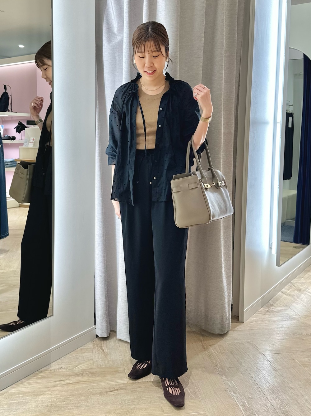 ・ドットフロッキーフリルネックブラウス リアルバイしました! 綿素材なので、 長袖ですがとても涼しく暑い日でも快適です◎ 袖口にしっかりゴムが入っているので、 まくっても落ちてきません✨ ネットに入れて洗濯機で洗っていますが、 普段はアイロンなしで着ています😊 (ピシッときれいに着たいときは、アイロンしていただくと良さそうです) ・ダブルクロスサテンイージーワイドパンツ 39サイズ着用 着用しているサイズは、 38サイズより着丈のみ+8㎝で高身長の方におすすめです! 裏地付きなので透けにくく、安心です。 ワイドパンツでも太過ぎないので 着膨れせず、すっきりとしたシルエットです✨