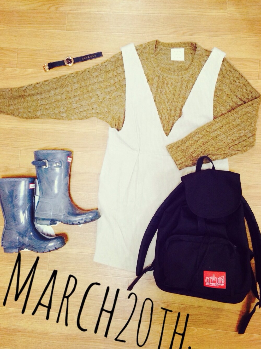 instagram⇨sknism___ やってます。 トップス:sence of place ジャンパースカート:KBF シューズ:HUNTER バックパック:ManhattanPortage