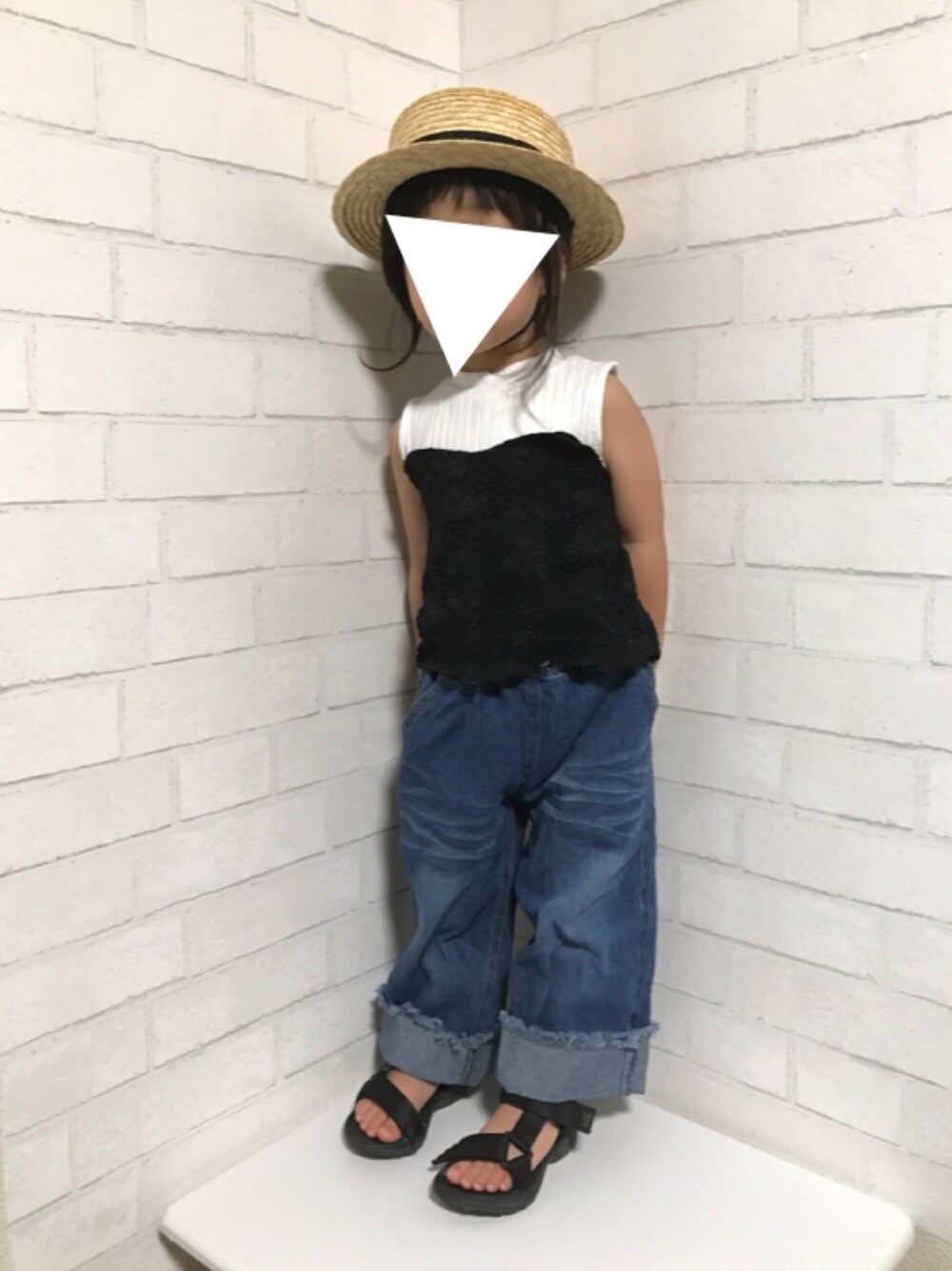 キャミソールをビスチェ風にしました☺︎ 娘。→88cm カンカン帽→52cm トップス→100cm デニム→95cm サンダル→16cm 見ていただき ありがとうございます🙏✨