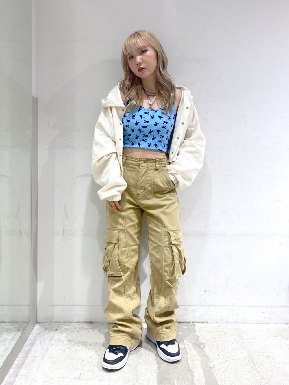 進藤さくら(X-girl Store)のカーディガン/ボレロ「CROSS JACQUARD CARDIGAN/ボリュームスリーブ/ショート丈 フード付きカーディガン/パーカー」を使ったコーディネート
